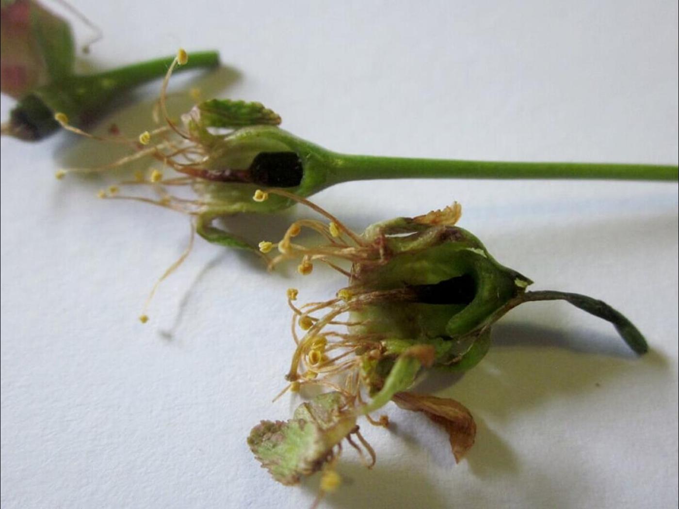 Fleur : Le pistil, observable à l’intérieur de la fleur ouverte, est nécrosé et bruni, alors qu’un pistil sain demeure vert. La fleur sèche et avorte.