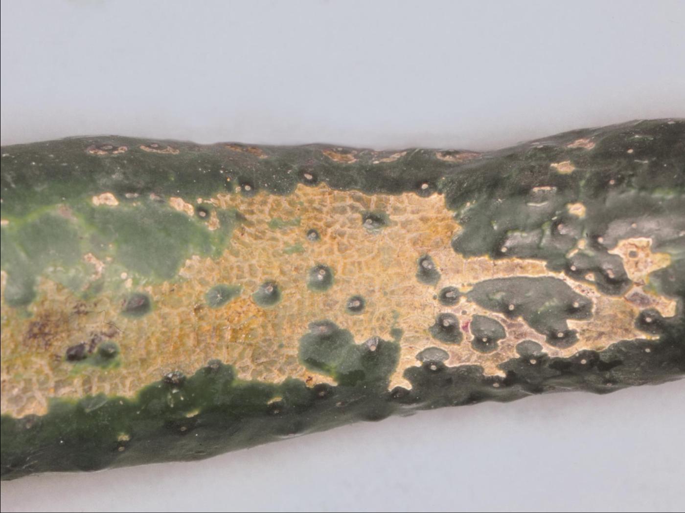 Fruit : développement de cicatrices liégeuses et superficielles sur l’épiderme. Les cicatrices sont blanches à brun pâle, longitudinales, et sont présentes sur un seul côté du fruit, et à l’occasion tout autour du fruit. Parfois, les fruits peuvent avorter.