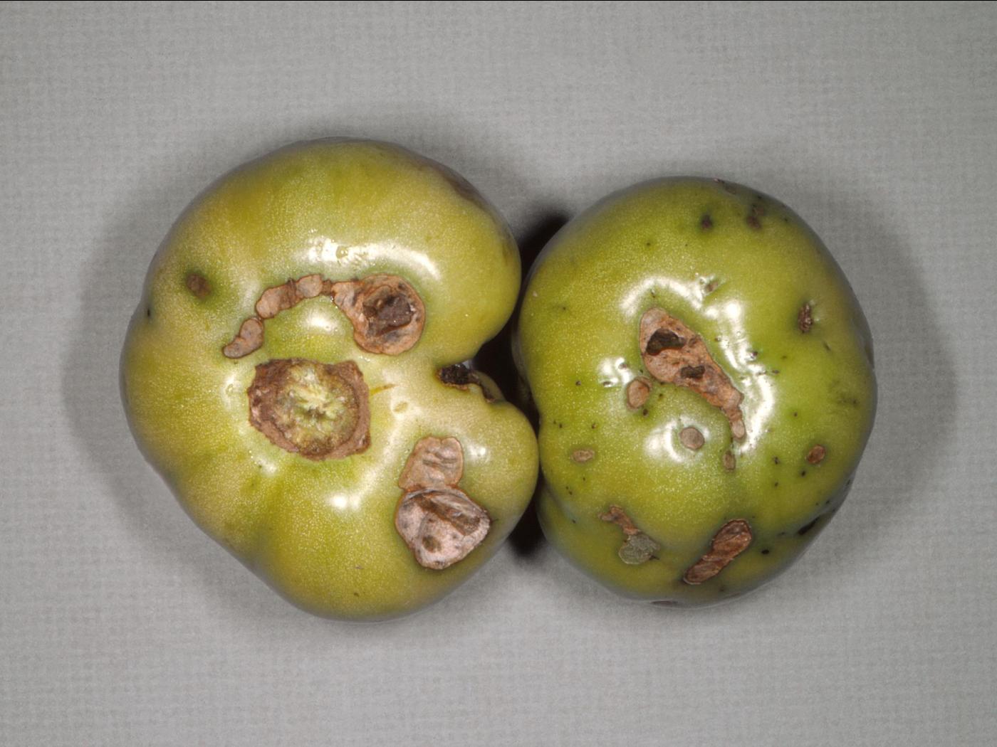 Description: Deux tomates cultivées au champ montrent des lésions circulaires à allongées, d’aspect liégeux, et dépressives. Quelques trous circulaires pouvant être assez profonds. Les dommages sont localisés sur le dessus ou sur un seul côté des fruits. Ces lésions sont causées par de la grêle survenue au cours de la saison.
