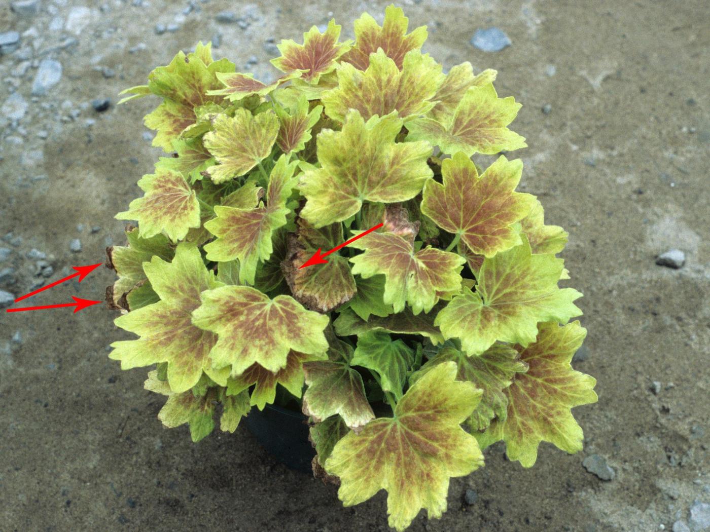 Description: Un plant de géranium zonal (cv 'Vancouver Centennial') provenant d’une serre montre des feuilles basales avec des brûlures marginales (voir flèches) et un limbe plus foncé (vert à bonze) que celui des feuilles médianes et terminales. Le pH du substrat est acide (pH 4,5). Le géranium est efficace à absorber le fer ou le manganèse lorsque le pH se situe entre 4,5 et 5,7. Le géranium zonal exige un pH entre 6,0 et 6,6.