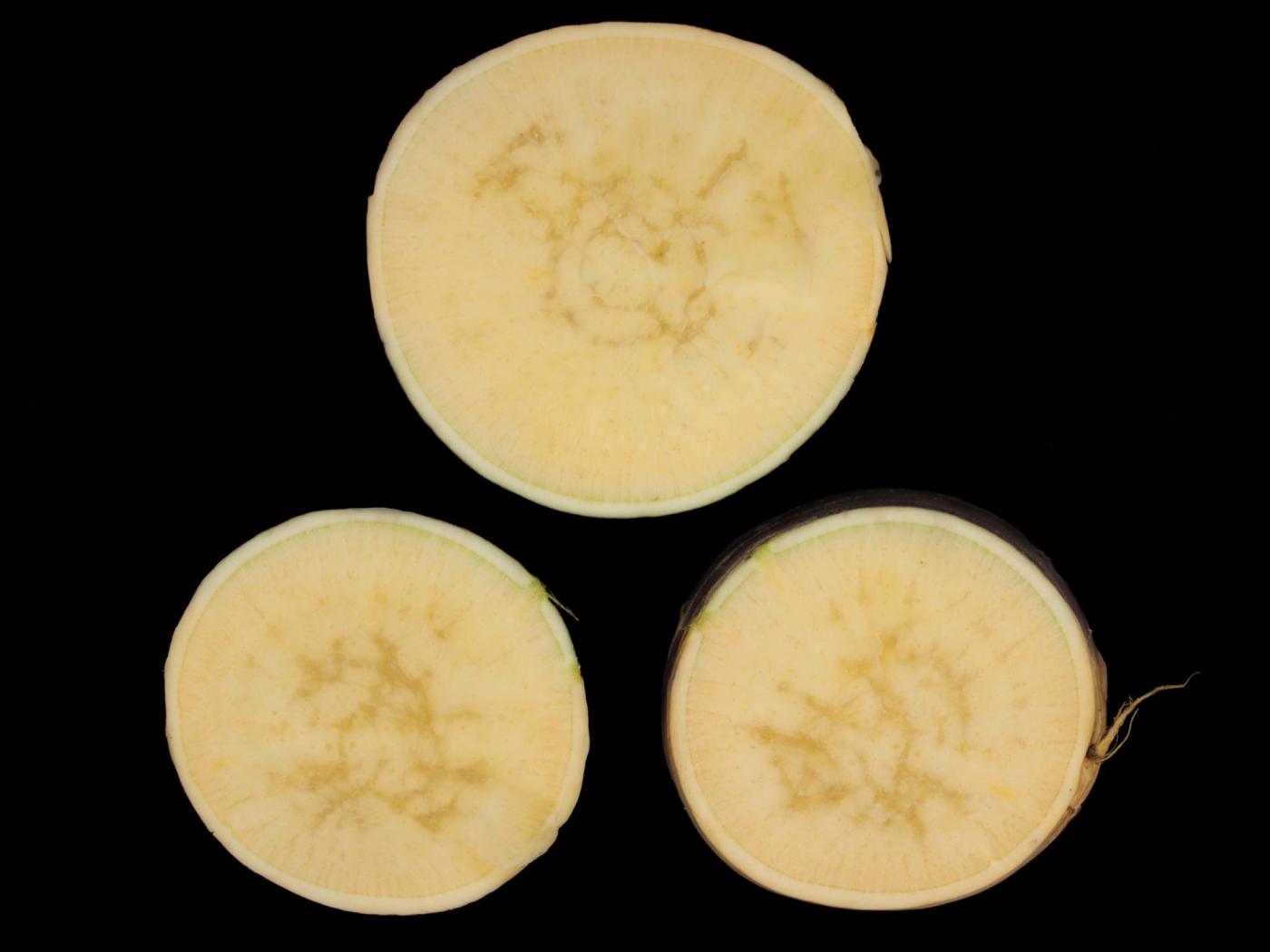 Racine : présence d’une coloration rouille ou brune pâle et de zones vitreuses et fermes dans le cœur de la racine tubérisée.