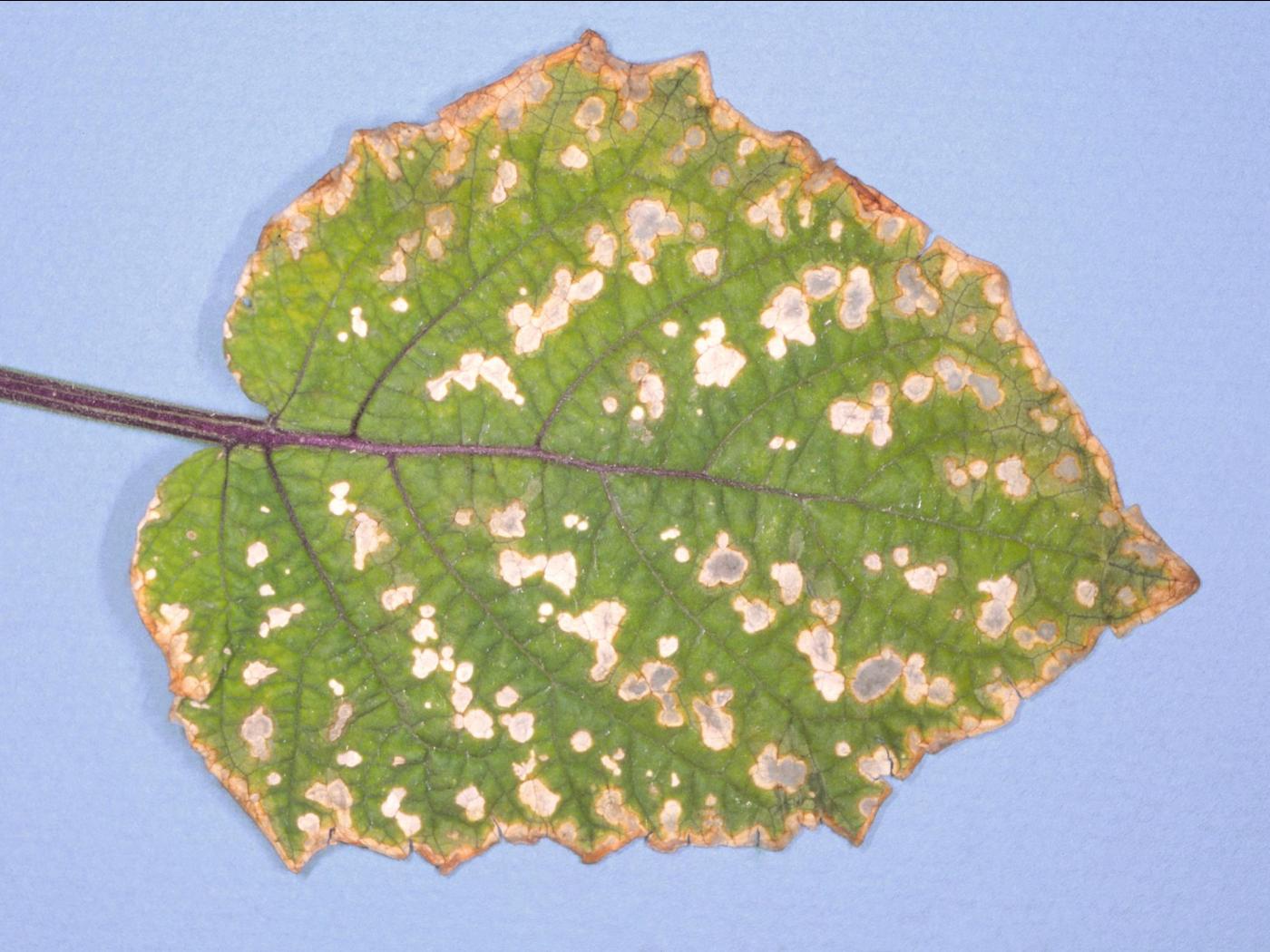 Feuille : présence d’une coloration grisâtre à blanchâtre du limbe des feuilles déployées ou non. Parfois présence d’une brûlure marginale. Dessèchement et mortalité des tissus affectés.