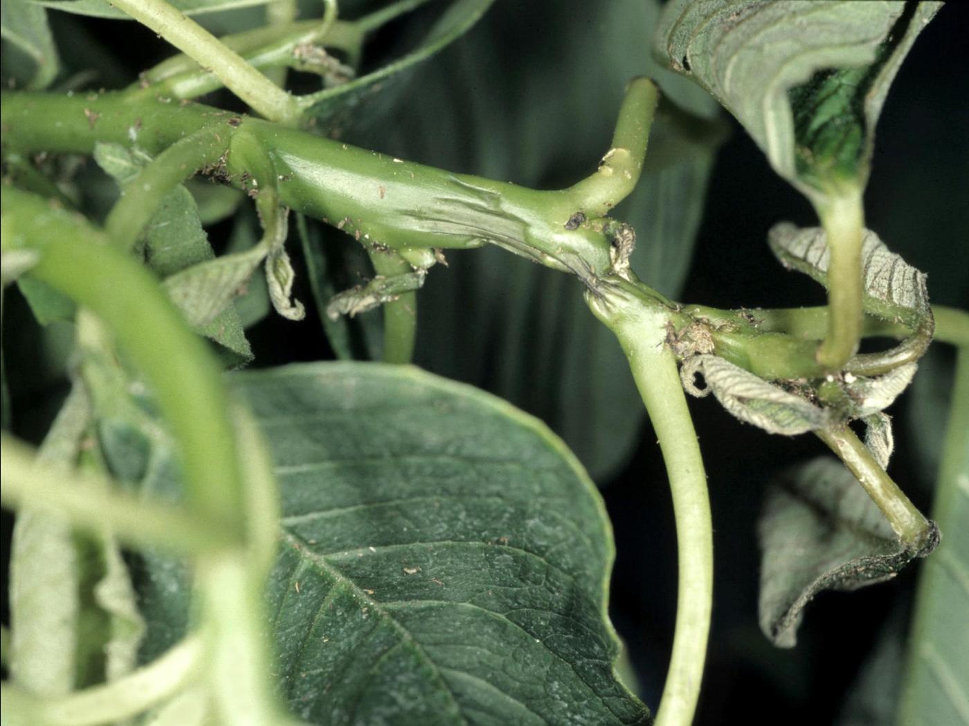 Tige : présence de chancres généralement situés à la même hauteur sur les plants. Les tiges peuvent casser. Le nombre de tiges formées après le pincement peut être réduit par la présence de pousses « aveugles » qui n’ont pas de bourgeons latéraux, empêchant le développement de nouvelles tiges.