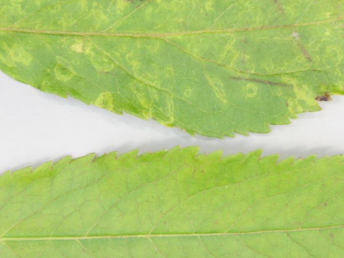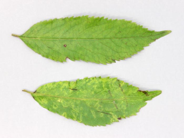 Comparaison entre une feuille saine et affectée de bugle rampant