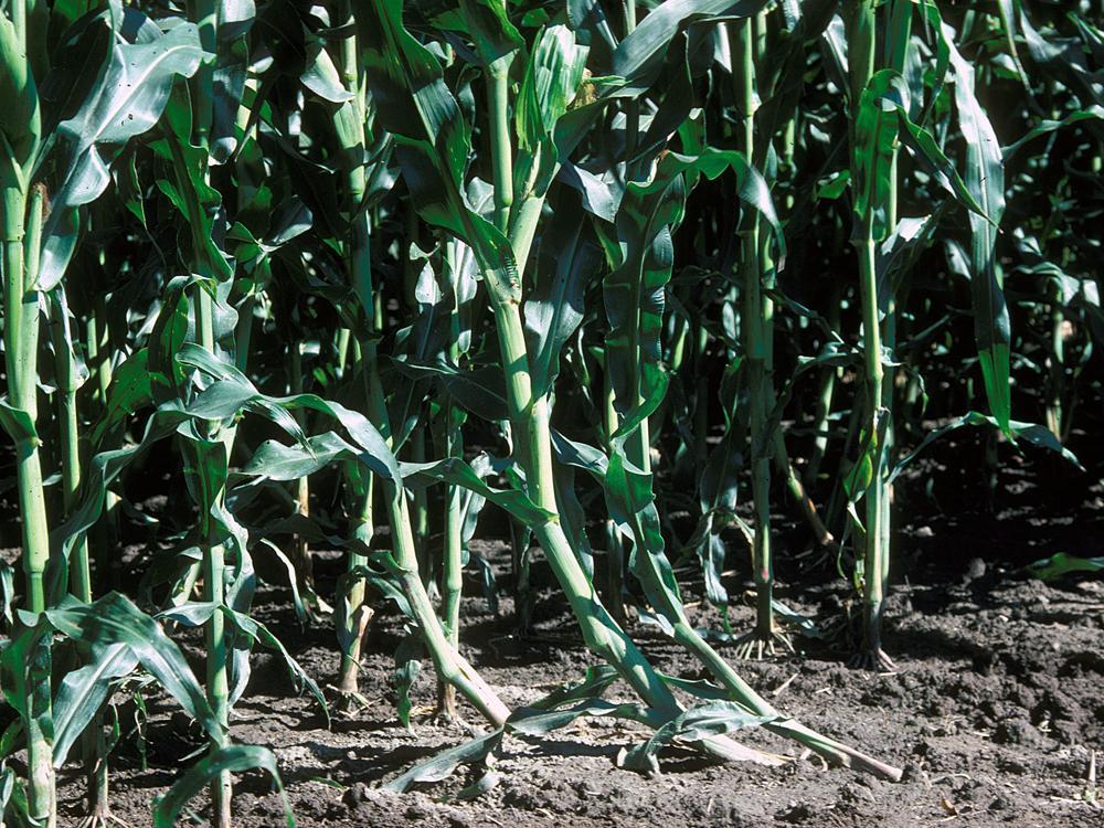 Trois plants de maïs avec la tige recourbée en forme de col de cygne, symptôme résultant des dommages causés par des chrysomèles des racines : les larves se nourrissent presque exclusivement de racines de maïs. Les jeunes larves grignotent les radicelles alors que les larves plus âgées creusent des galeries dans les racines d'ancrages. Les plants endommagés sont alors susceptibles de pencher ou de verser. Certains plants prennent alors la forme d'un col de cygne lorsqu'ils se courbent vers le haut dans un effort pour se redresser. Les larves transmettent les Fusarium des racines.