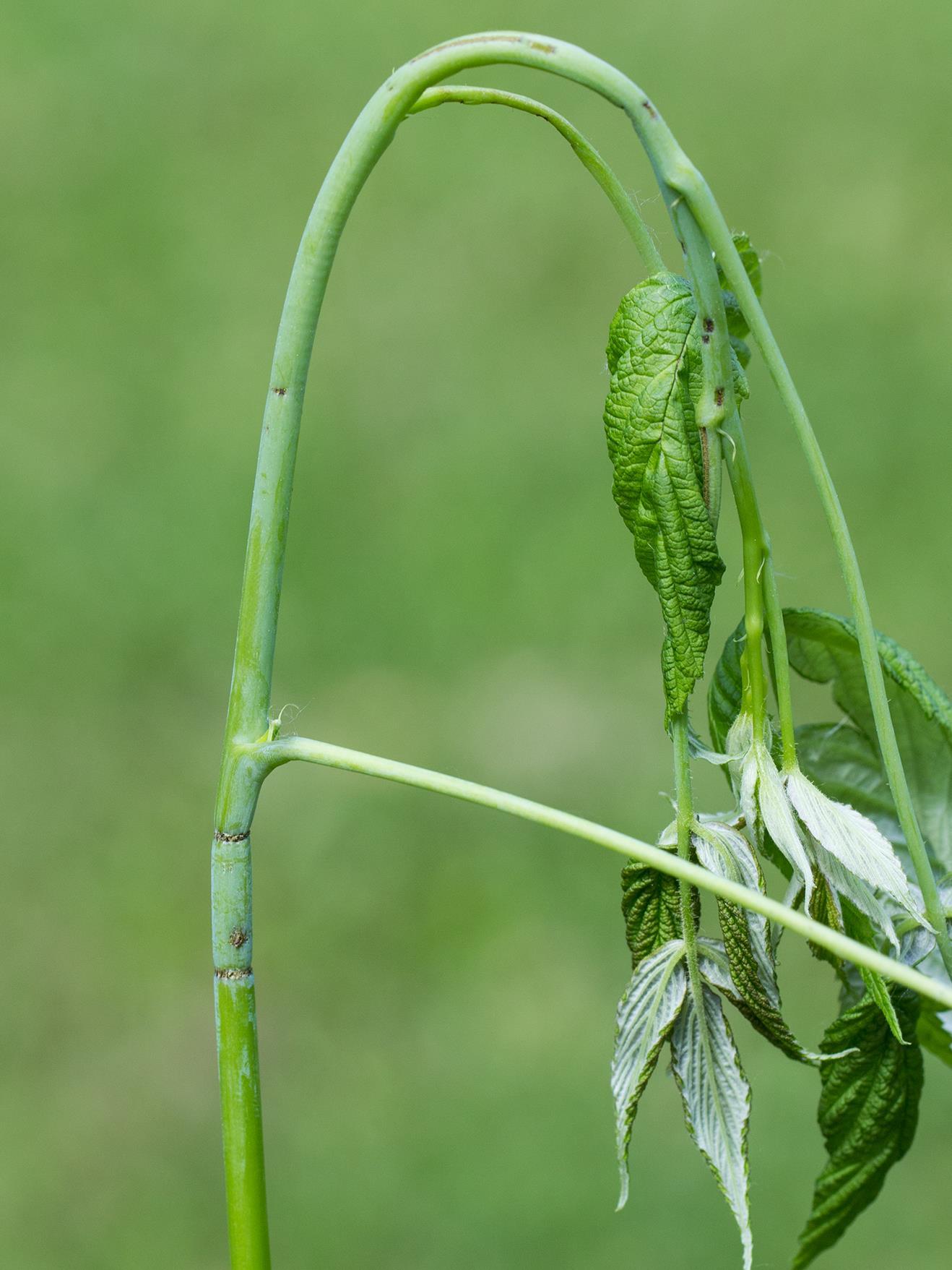 Apex d'un plant de framboisier portant deux cicatrices distancées et entourant la tige (en forme d'anneaux). La femelle grignote la tige pour former deux anneaux et dépose ensuite un oeuf entre les cicatrices. La partie située au-dessus des cicatrices flétrit et tombe.