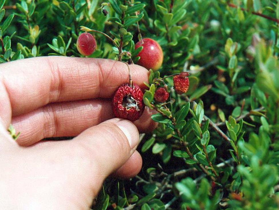 Description: Canneberge présentant des dommages causés par une larve de seconde génération de la tordeuse soufrée. Au printemps, les larves hibernantes se nourrissent des nouvelles pousses et tissent des toiles sur le feuillage. Les larves de la nouvelle génération (mois d'août) se nourrissent de feuilles ainsi que de fruits. Les fruits sont grignotés en surface, évidés et présentent un grand trou en surface. Les dommages sont souvent localisés en bordure de champs et dans les champs à haut rendement.