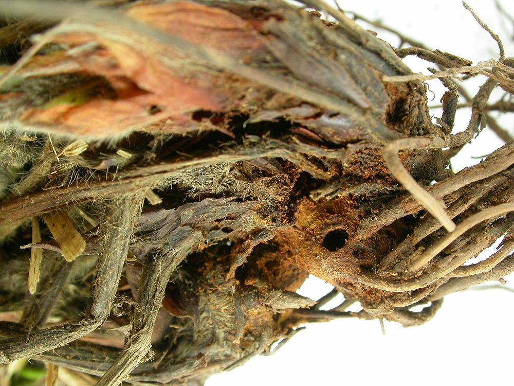 Description: Collet d'un plant de fraisiers présentant un trou creusé par la larve du charançon noir de la vigne. Le dégât d'alimentation de la larve cause un affaiblissement de la plante, entraînant parfois le rougissement de la marge des feuilles suivi du flétrissement et de l'assèchement du plant à l'apparition des fruits.