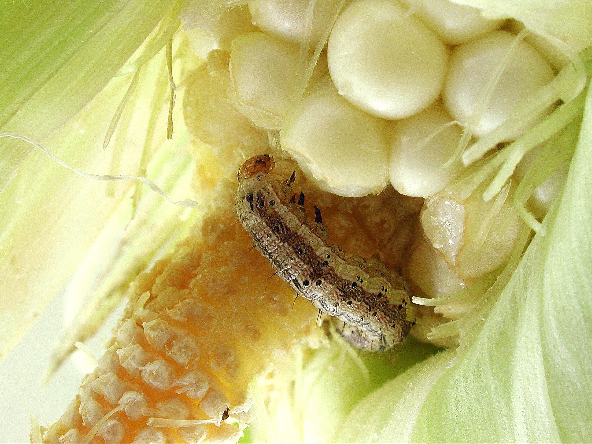 Description: Épi de maïs endommagé par une larve de vers de l'épi : la jeune larve s'est attaquée aux grains non développés présents sur la pointe de l'épi. Après avoir ingéré ceux-ci, elle commence à s'alimenter sur les gros grains plus développés.