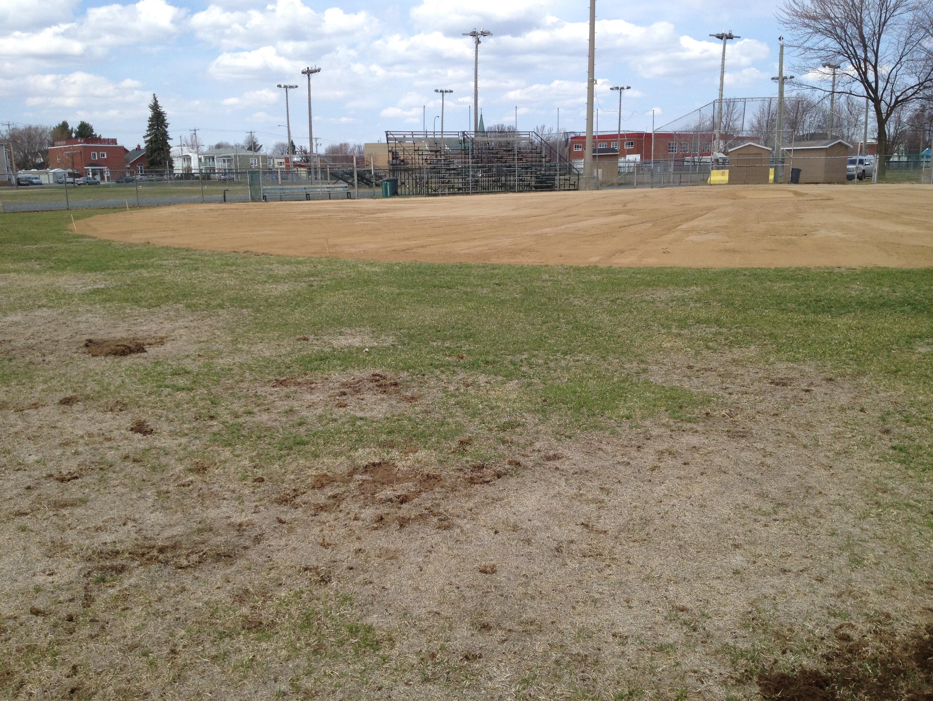 Description: Les larves de hanneton européen consomment les racines de plusieurs espèces de graminées. Sur la photo, on observe un jaunissement important du gazon présent sur un terrain de baseball dans un parc urbain. En plus des dommages directs causés par les larves s'attaquant aux racines, la présence de ce ravageur attire certains prédateurs qui creusent des trous à la recherche de nourriture. En effet, les moufettes et les ratons laveurs peuvent retirer des couches de gazon afin d'atteindre les larves qui se trouvent sous celles-ci. Les trous dans le gazon observés sur la photo ont été causés par ces prédateurs.