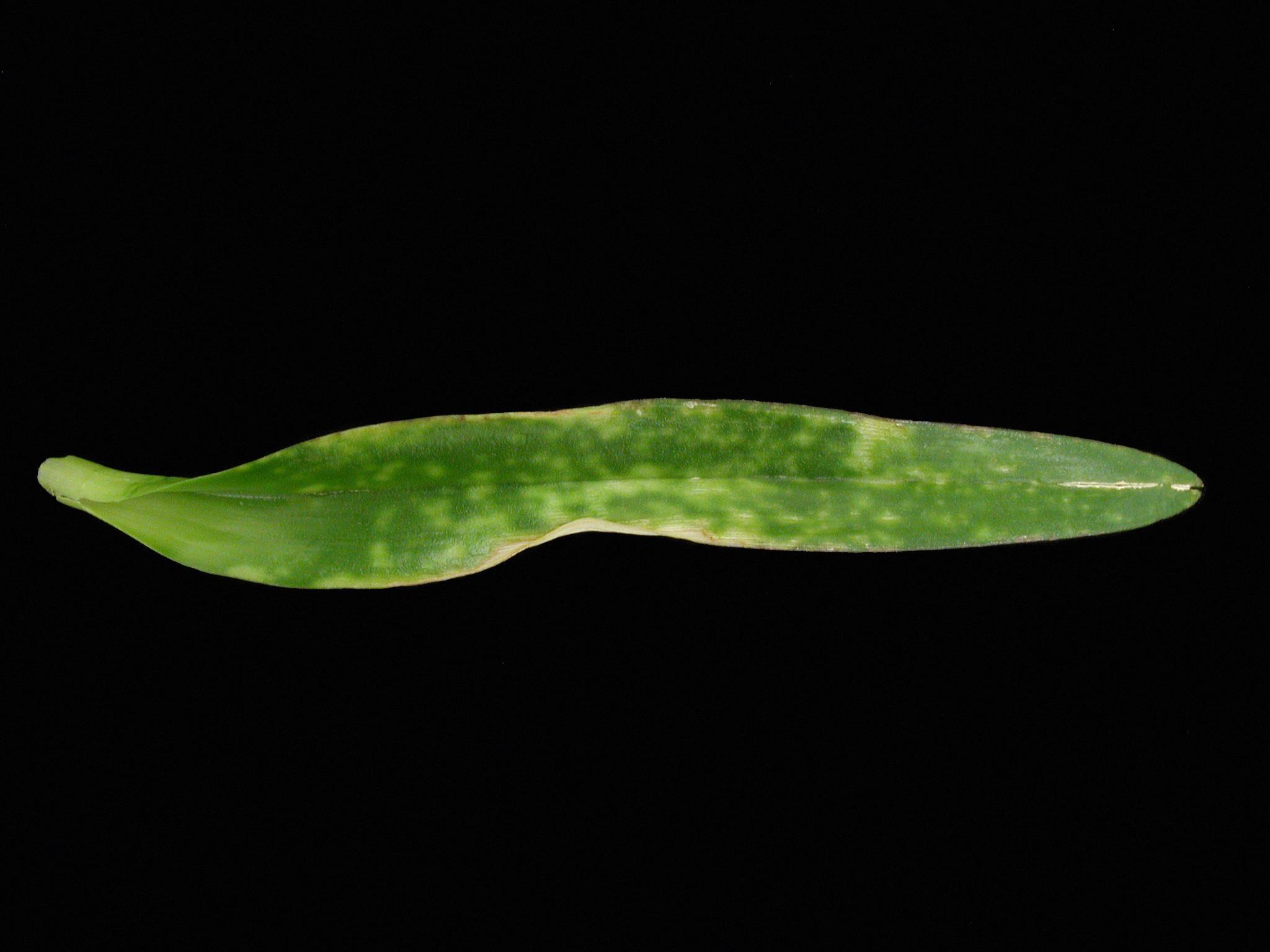Description: Une feuille terminale d’une orchidée Dendrobium montre des taches diffuses et de marbrures jaunes. Les tests de laboratoire ont révélé la présence du virus de la mosaïque du cymbidium (CyMV).