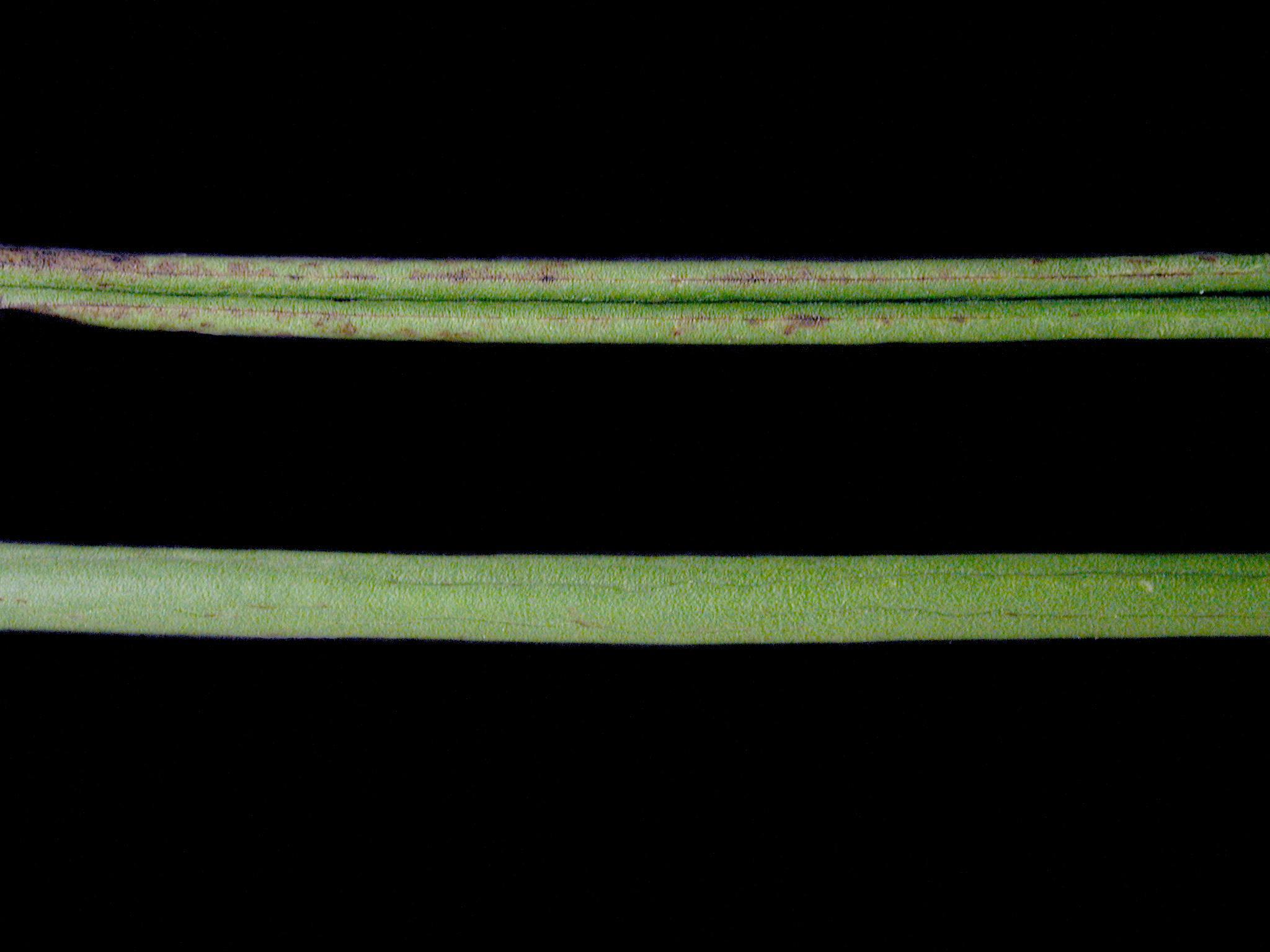 Description: Une feuille d’orchidée Brassavola (cv 'Tuberculata') présente des taches longitudinales rouges à noires. Un côté de la feuille est parfois exempt de symptôme. Tous les niveaux de feuille étaient touchés. Les tests de laboratoire ont révélé la présence du virus de la mosaïque du cymbidium (CyMV).