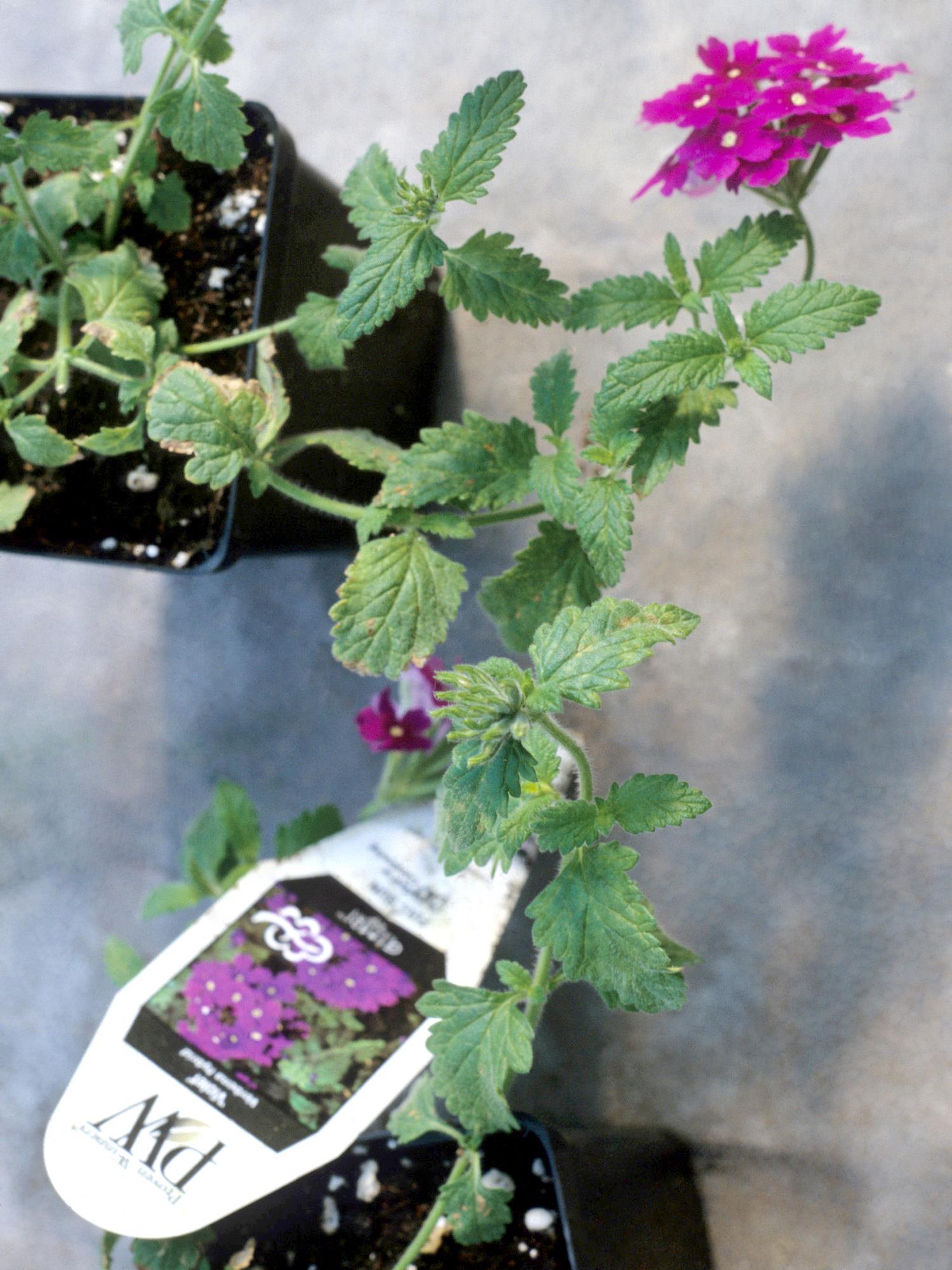 Description: Des plants de verveine montrent des jeunes feuilles avec des taches ou zones irrégulières vert pâle à jaunes et de minuscules taches brunes et sèches entre les nervures. Sur les feuilles plus âgées, présence d’une brûlure marginale et de quelques taches brunes et sèches sur le limbe. Les tests de laboratoire ont révélé la présence du virus de la tache nécrotique de l'impatiente (INSV).