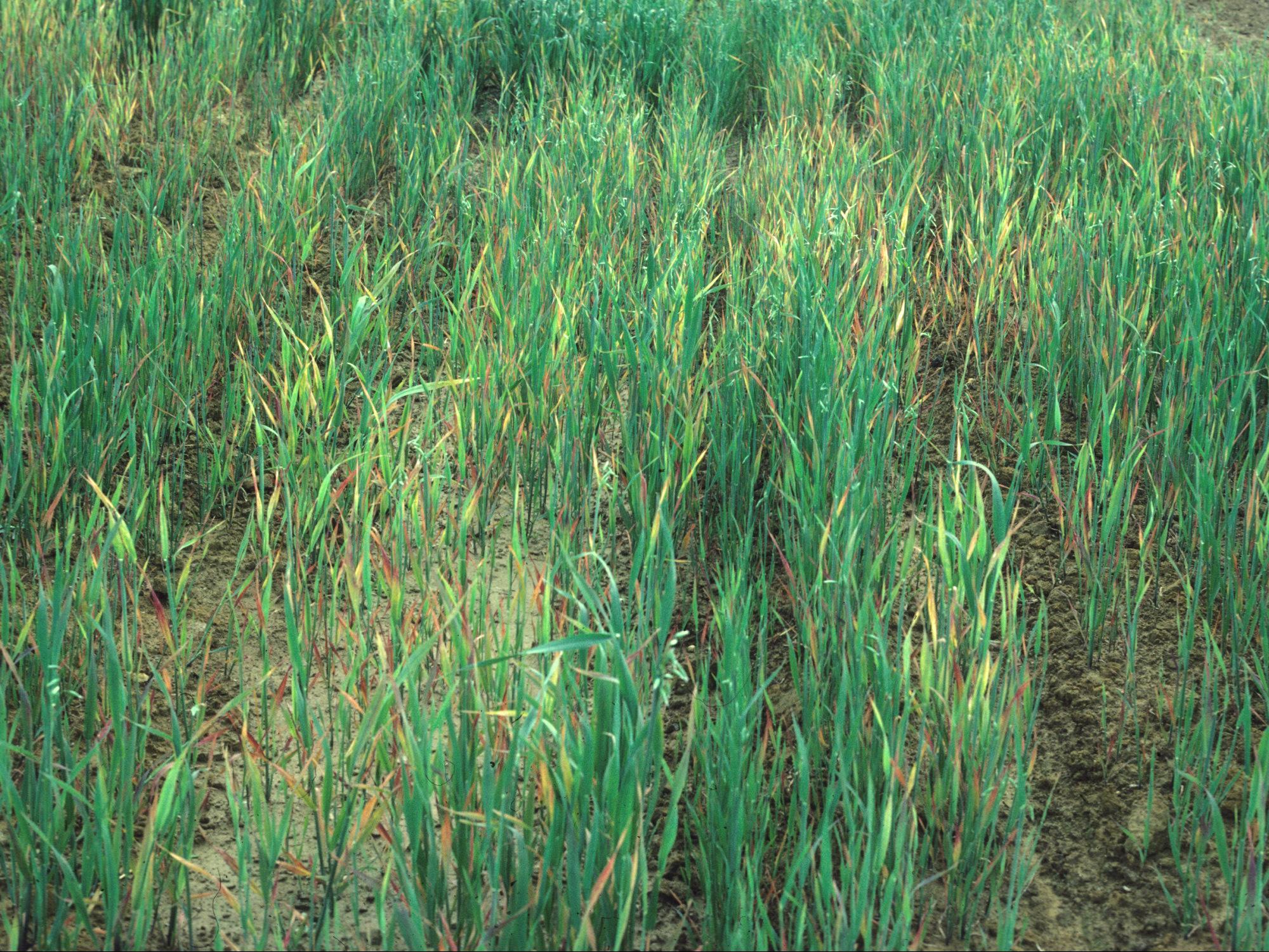 Description: Les feuilles d’avoine ont une coloration jaune orangé à rouge. Elles sont regroupées en petits foyers au champ. Les tests de laboratoire ont confirmé la présence du virus de la jaunisse nanisante de l’orge.