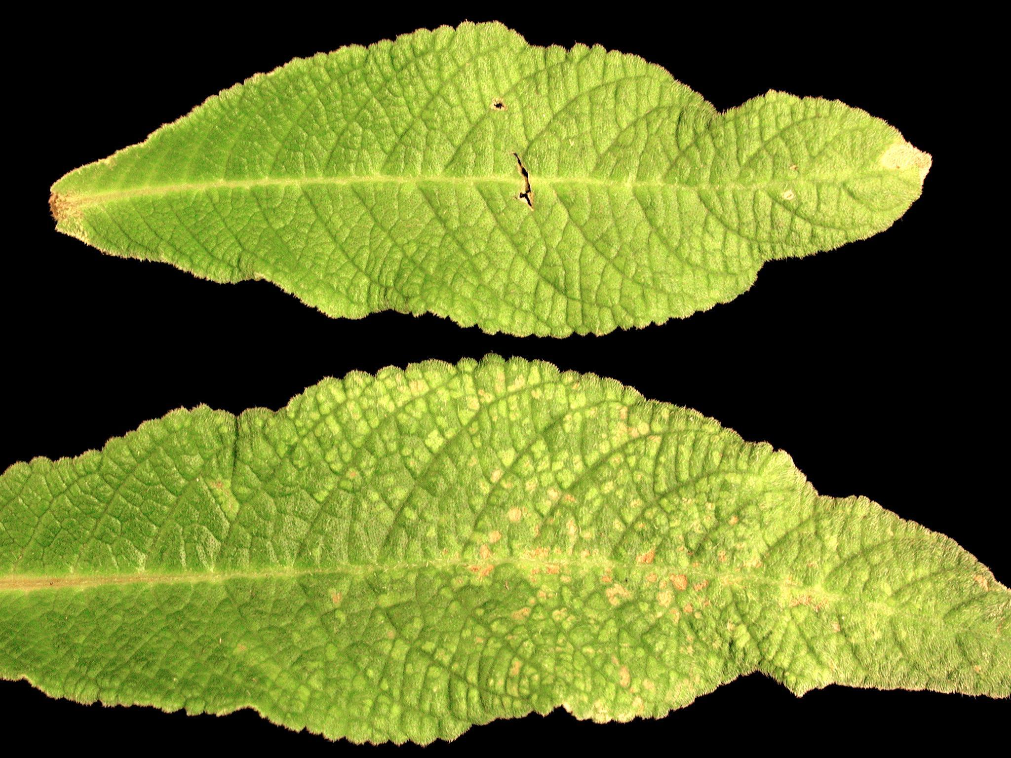 Description: Des feuilles de streptocarpe (primevère du Cap) montrent des symptômes d’une intensité différente. La feuille du bas montre un jaunissement ayant la forme d’une mosaïque répartie sur presque toute la surface du limbe. De petites taches angulaires brunes accompagnent le jaunissement. La feuille en haut présente une brûlure à l'apex et un léger jaunissement du limbe. Sur les deux feuilles, la marge est irrégulière. Les tests de laboratoire ont révélé la présence du virus de la tache nécrotique de l'impatiente (INSV).