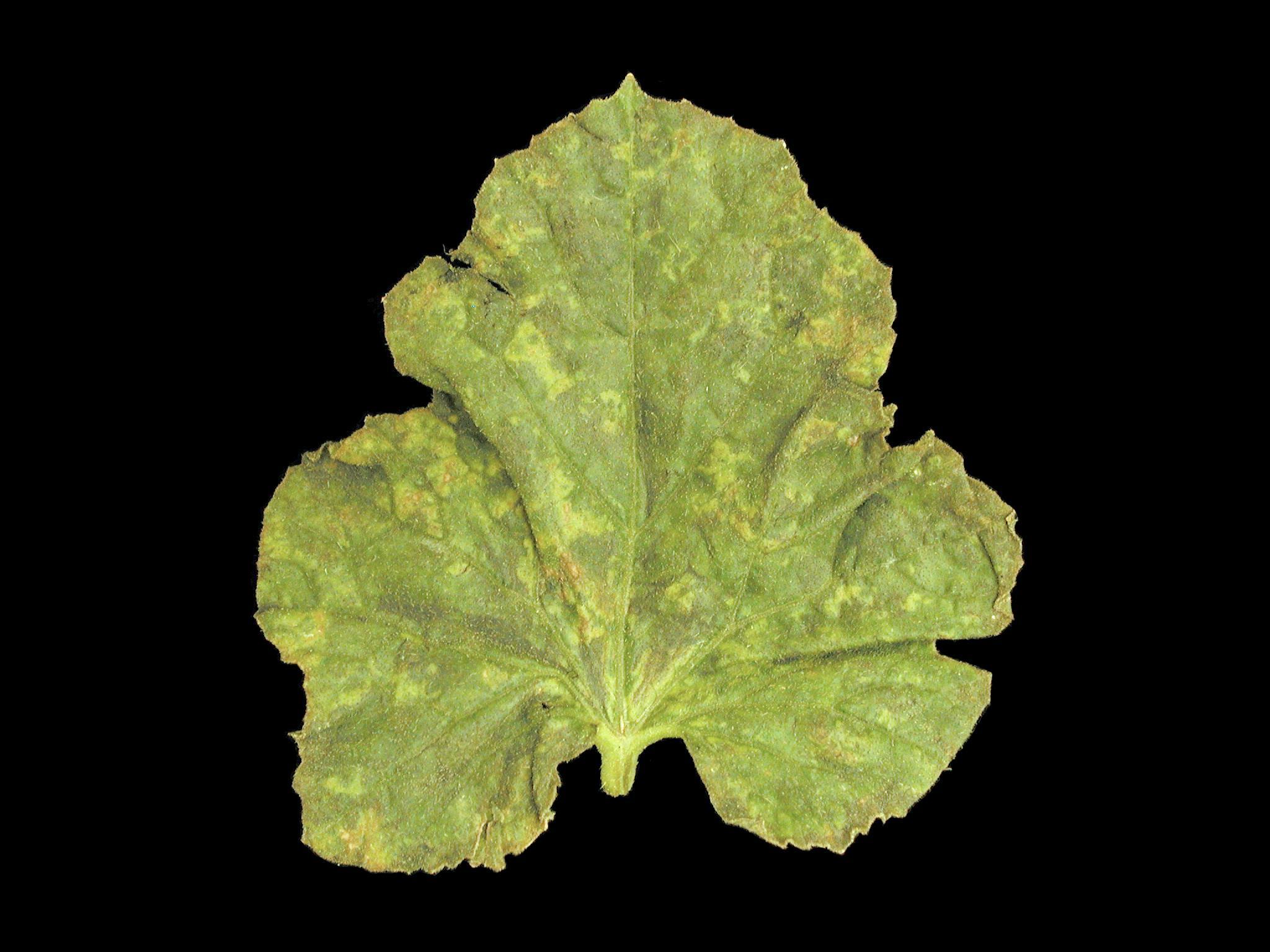 Description: Sur une feuille d'un melon brodé, présence d’une mosaïque jaune et vert pâle répartie uniformément sur toute la surface du limbe. La marge de la feuille est légèrement déformée. Les tests de laboratoire ont révélé la présence du virus de la mosaïque du concombre (CMV). La conseillère agricole mentionne que 80 % des plants présentent les symptômes, ce qui est inusité pour une maladie parasitaire.