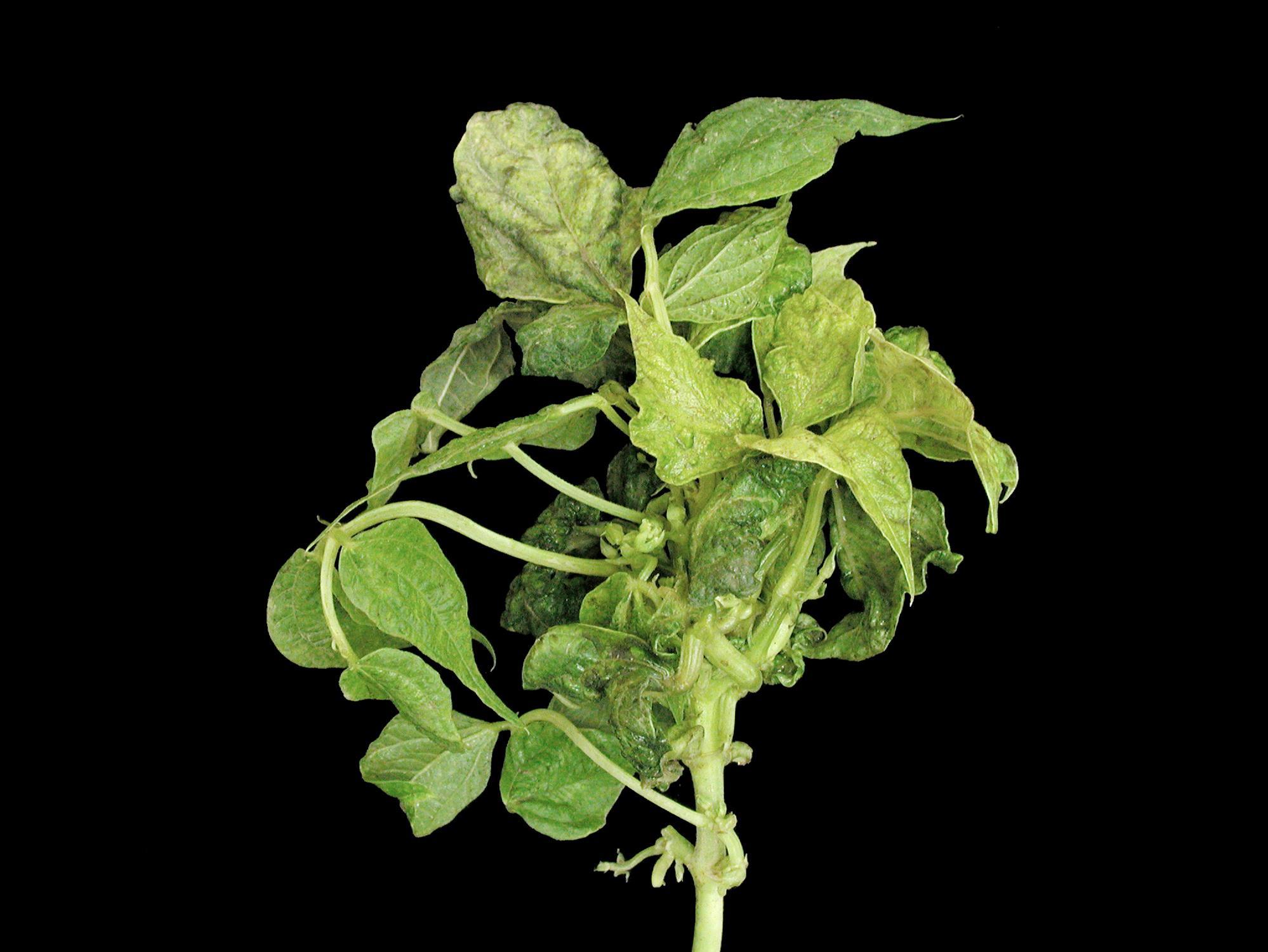 Description: Un plant de haricot est rabougri et peu développé. Les entrenoeuds sont courts et les feuilles sont petites et déformées (bosselées, marge courbée vers le haut ou le bas). Certaines feuilles montrent une mosaïque jaune-vert. Les tests de laboratoire ont révélé la présence du virus de la mosaïque du concombre (CMV).