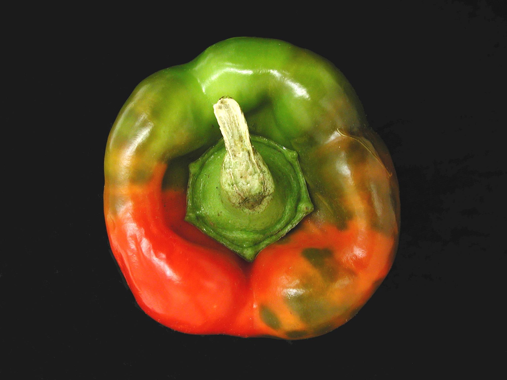 Description: Une vue du dessus d’un poivron de champ montre une moitié verte et une moitié rouge. Sur la partie rouge, des taches circulaires vertes sont visibles. Les tests de laboratoire ont révélé la présence du virus de la mosaïque du concombre (CMV).