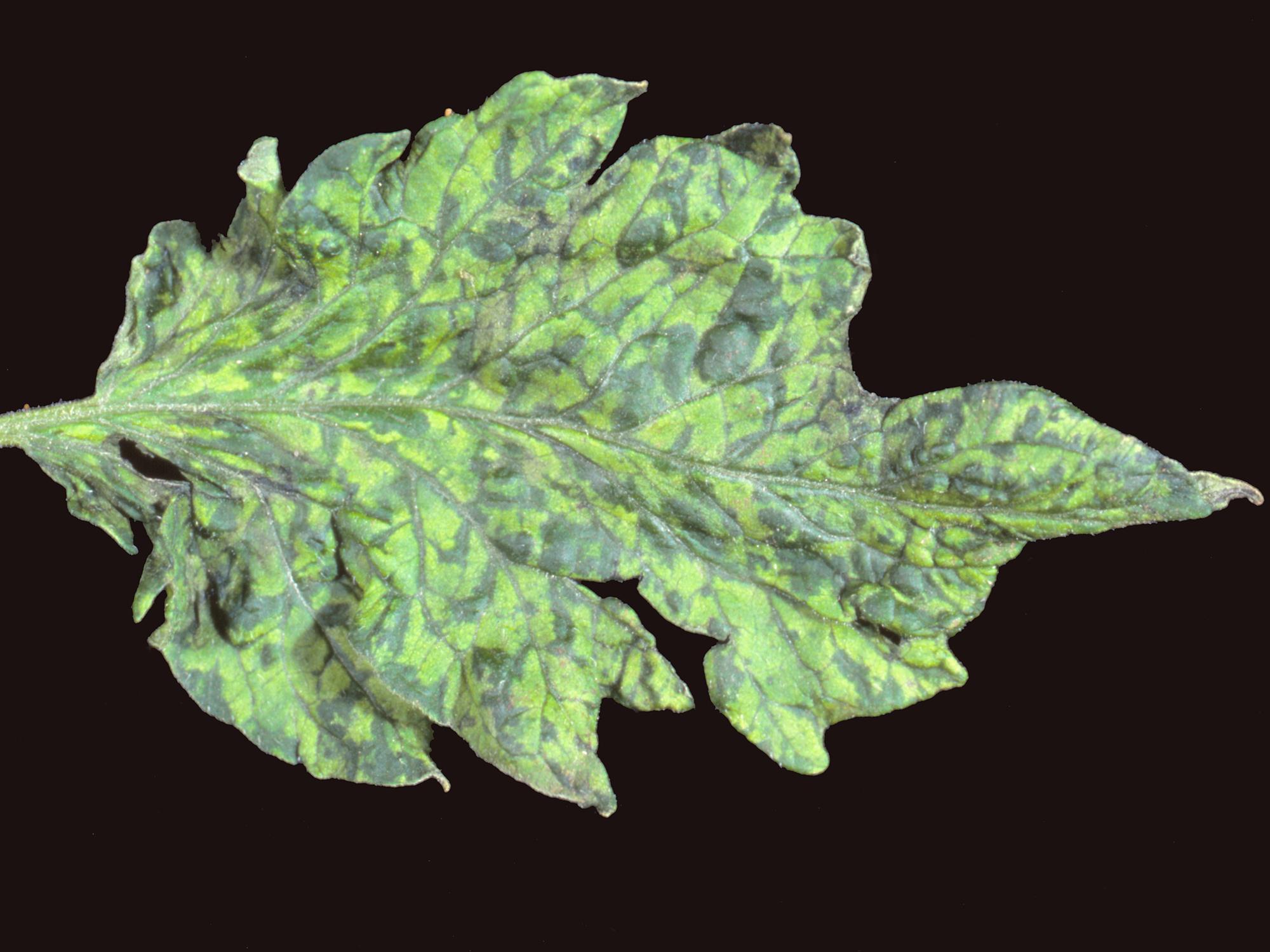Description: À la face supérieure d’une foliole de tomate de serre, présence d’une anomalie de coloration caractérisée par une mosaïque vert pâle et vert foncé, localisée essentiellement entre les nervures. La marge et l’apex sont déformés. Les tests de laboratoire ont révélé la présence du virus X de la pomme de terre (PVX).