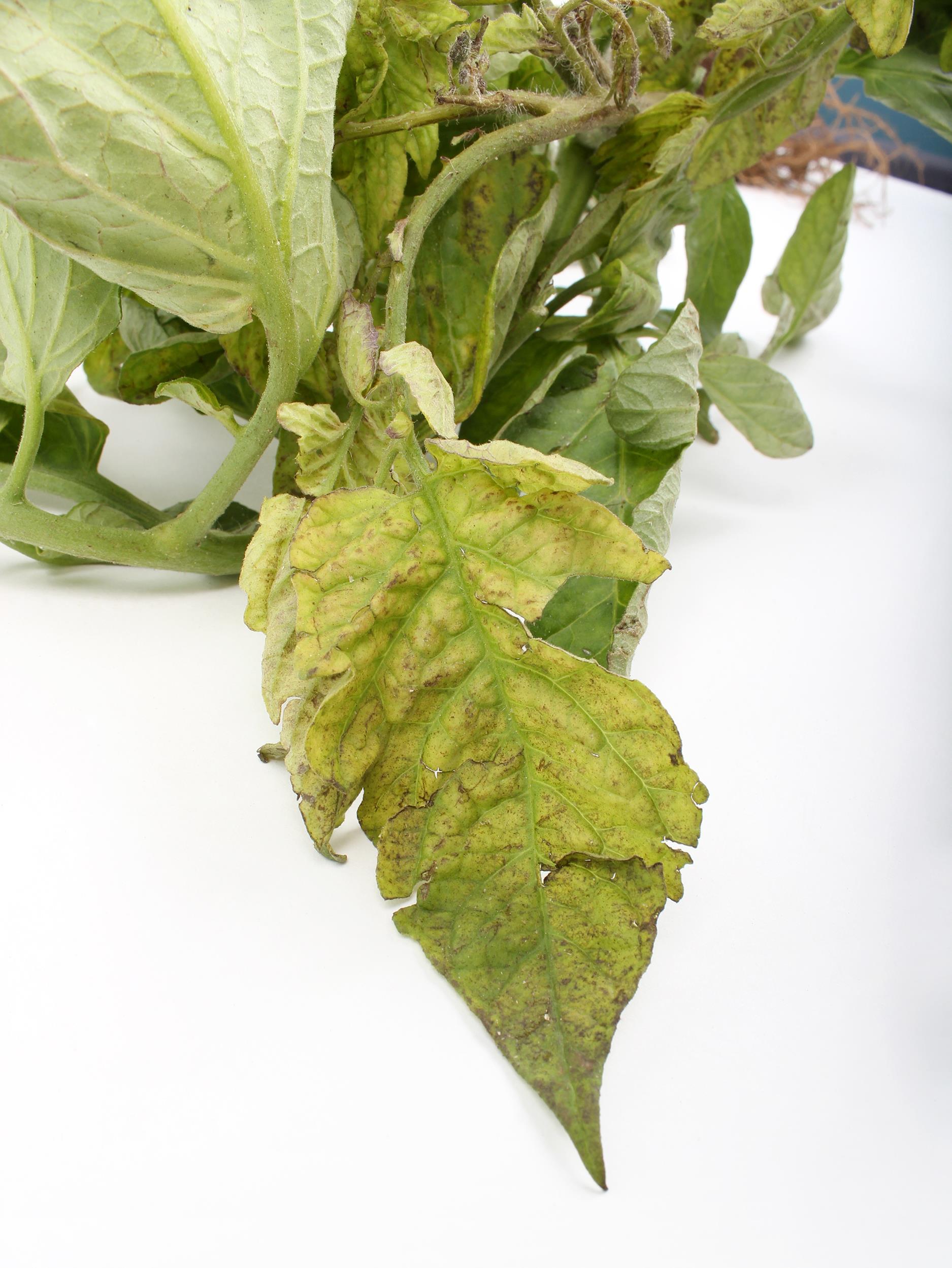 Légende: Anomalies de coloration sur foliole de tomate