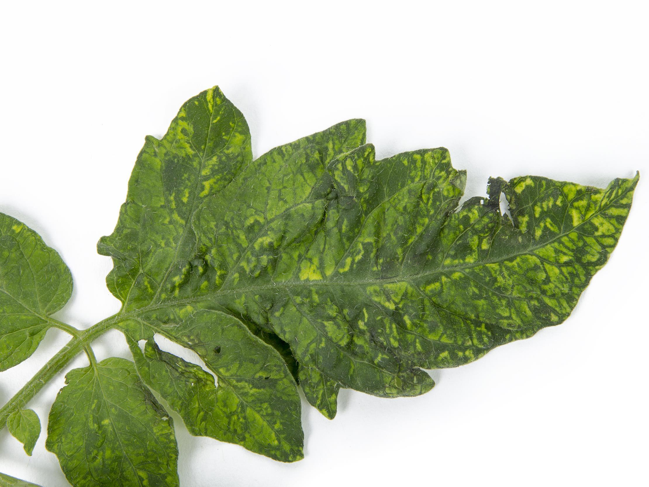 Légende: Mosaïque foliaire causée par le virus du fruit brun rugueux de la tomate (Tomato brown rugose fruit virus, ToBRFV)