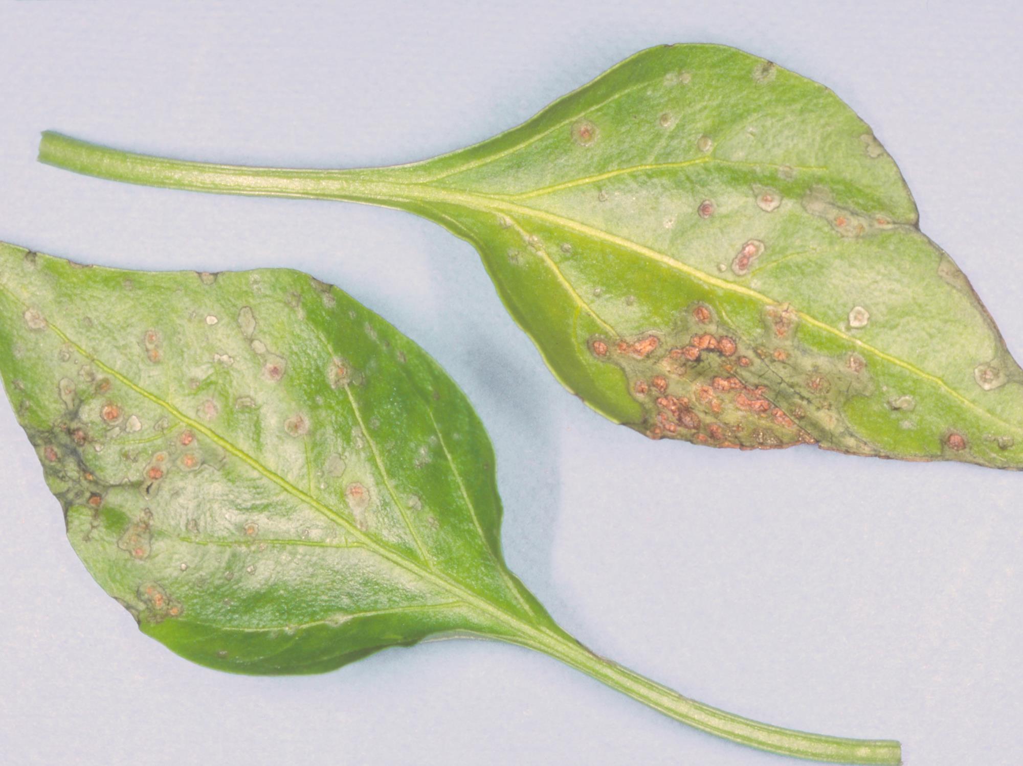 Description: À la face supérieure des feuilles de plantules de poivron cultivé en serre, présence de petites taches circulaires dont le diamètre moyen se situe entre 1 et 2 mm. Au début, les taches sont blanchâtres avec un petit point brun au centre. Les taches deviennent brunâtres et prennent une apparence liégeuse. Absence d’un halo jaune. Les taches ont une apparence sèche. Les tests de laboratoire ont révélé la présence de la bactérie Clavibacter michiganensis subsp. michiganensis, responsable du chancre bactérien.
