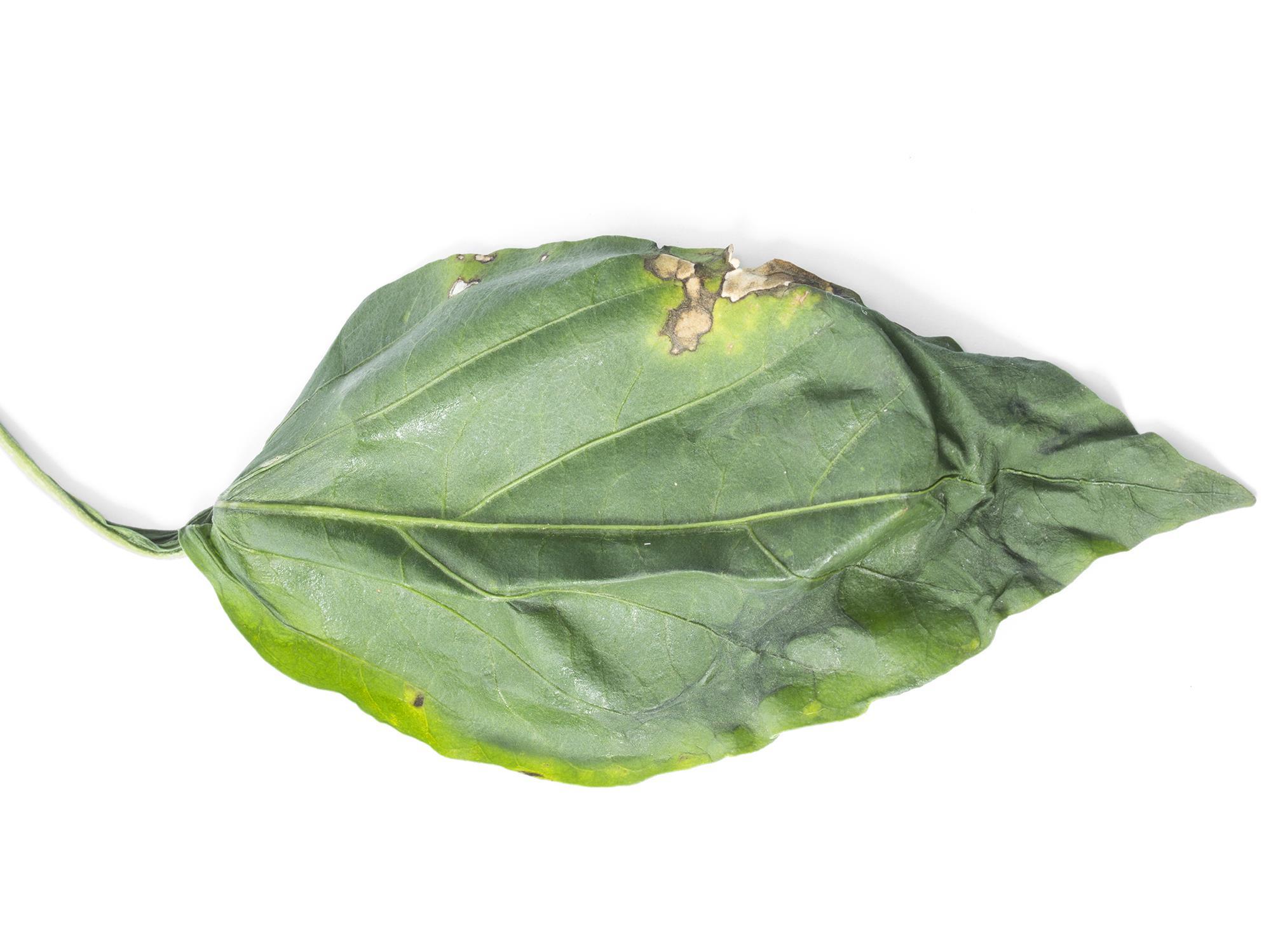Description: À la face supérieure d’une feuille de poivron, présence de taches plutôt angulaires, beiges avec une marge brun foncé. Elles sont d’une apparence sèche, ressemblant à des brûlures, et présentent un halo jaune. Les taches sont localisées à la marge de la feuille. Les tests de laboratoire ont révélé la présence de la bactérie Pseudomonas caripapayae, appartenant au groupe des Pseudomonas syringae, responsable de la moucheture bactérienne chez le poivron.