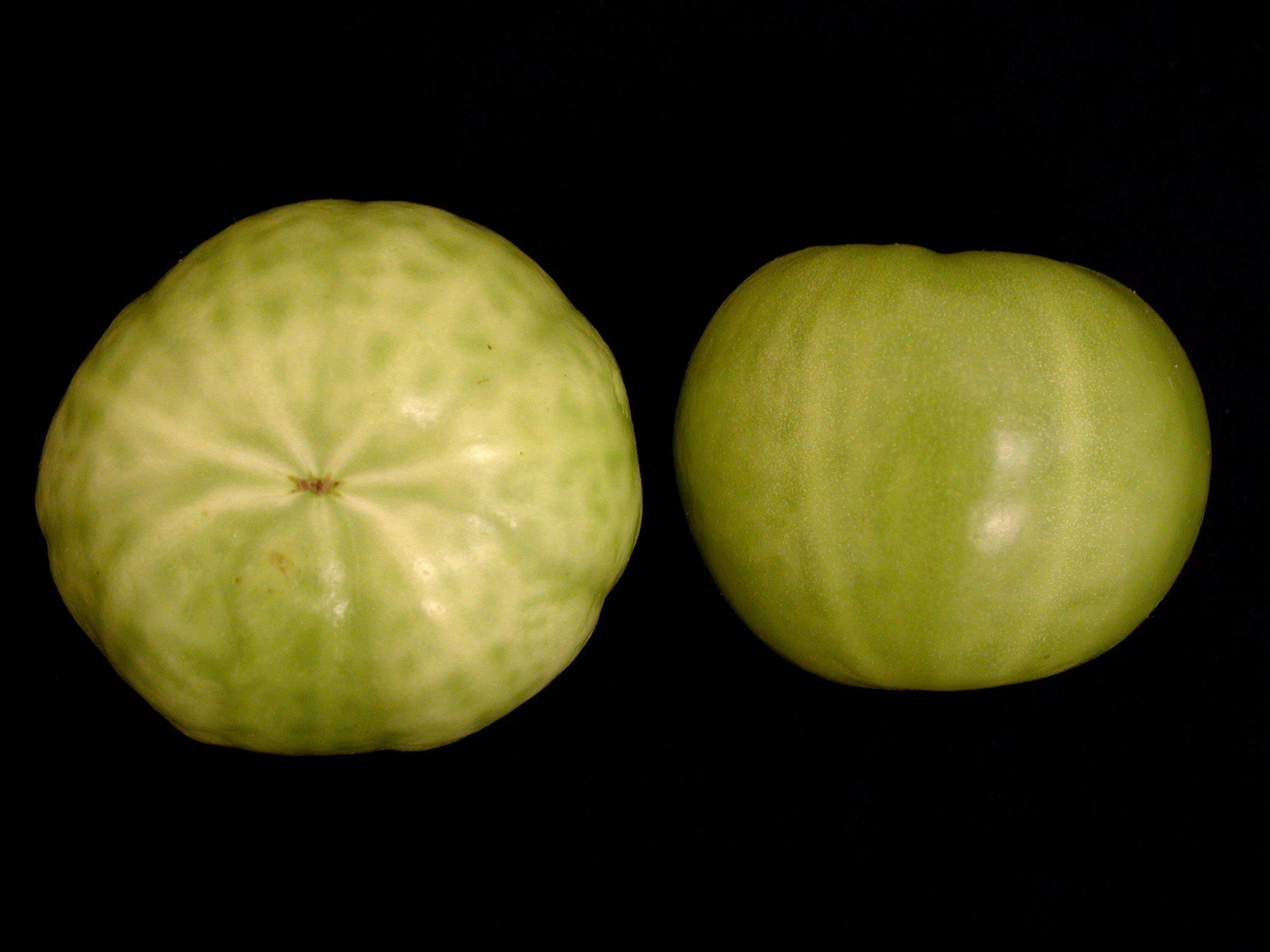 Description: Des tomates de serre vertes (cv 'Blitz') montrent des lignes blanches qui débutent dans la zone pédonculaire et qui progresse sur l’épiderme vers la zone stylaire. Ces lignes blanches sont en fait les vaisseaux des fruits. Les tests de laboratoire ont révélé la présence de la bactérie Clavibacter michiganensis subsp. michiganensis, responsable du chancre bactérien chez la tomate.