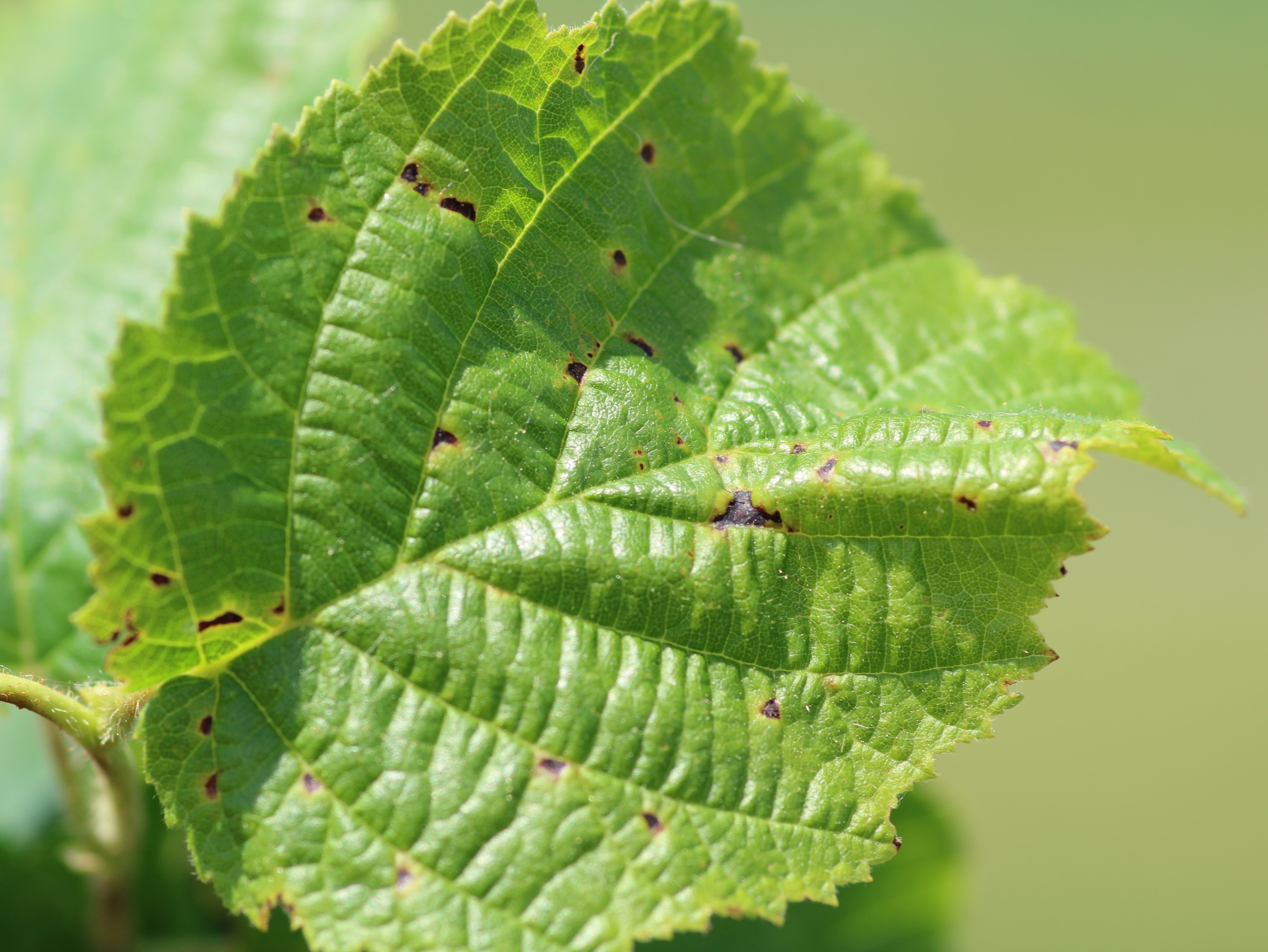 : Taches angulaires brunes à noires sur des feuilles de noisetier, symptômes de brûlure bactérienne.
