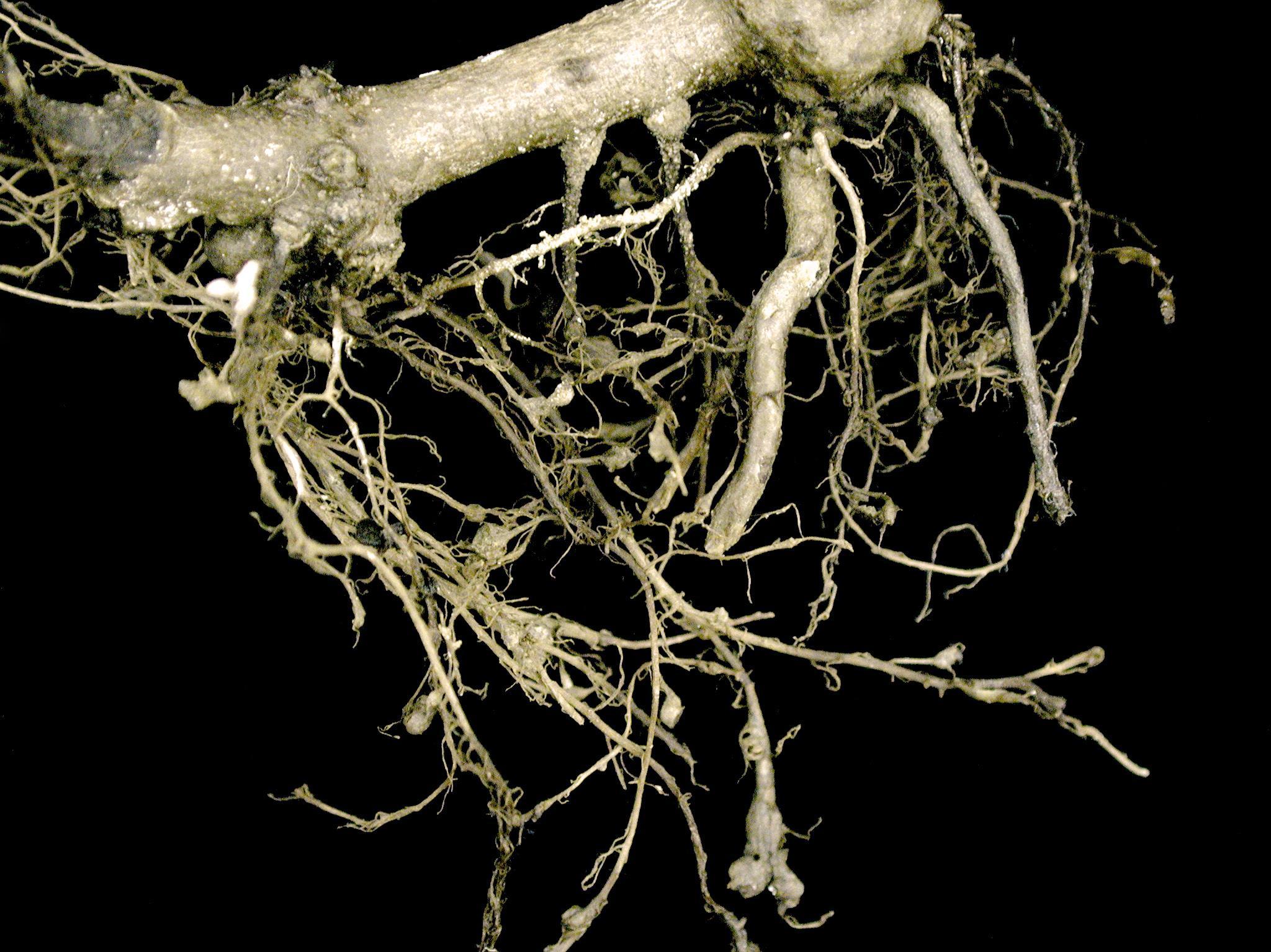Description: Le système racinaire d'un bégonia jamaïcensis est peu développé. Les racines sont brunes et portent des nodosités distribuées aléatoirement sur celles-ci. La tige et les feuilles sont flétries (non visible ici). Les observations microscopiques des nodules ont révélé la présence du nématode Meloidogyne sp. Ce nématode est responsable de la nodosité des racines.