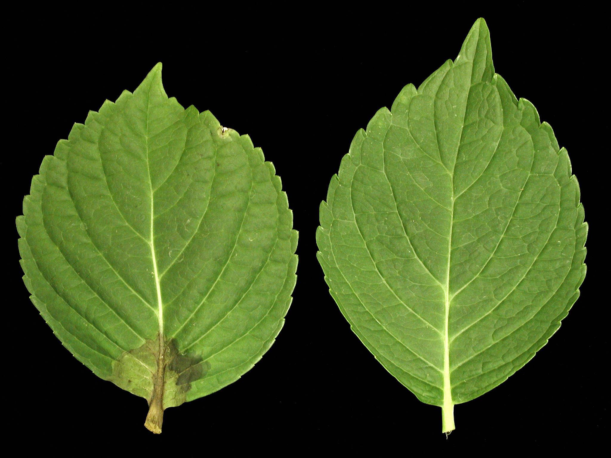 Description: Lorsque comparé à une feuille sans symptôme, le pétiole et la base du limbe d’une feuille d’hydrangée à grandes feuilles (cv 'Mathilde Gütges') provenant d’une serre sont bruns à noirs et translucides. Le pétiole est brun et ramolli. Les tests de laboratoire ont révélé la présence du nématode des tiges et des bulbes Ditylenchus dipsaci.