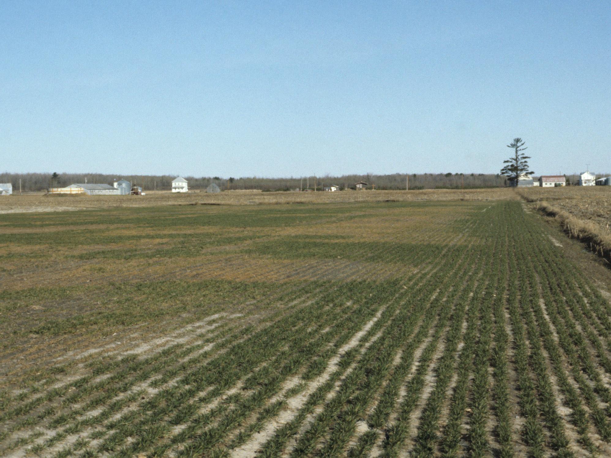Description: Dans un champ de blé d’automne, les zones brunes sont composées de plants desséchés qui ont eu une mauvaise survie à l'hiver. Les zones où les plants sont morts correspondent à de petites baissières où l'eau s'est accumulée et où les plants sont morts par asphyxie par la glace (gel hivernal).