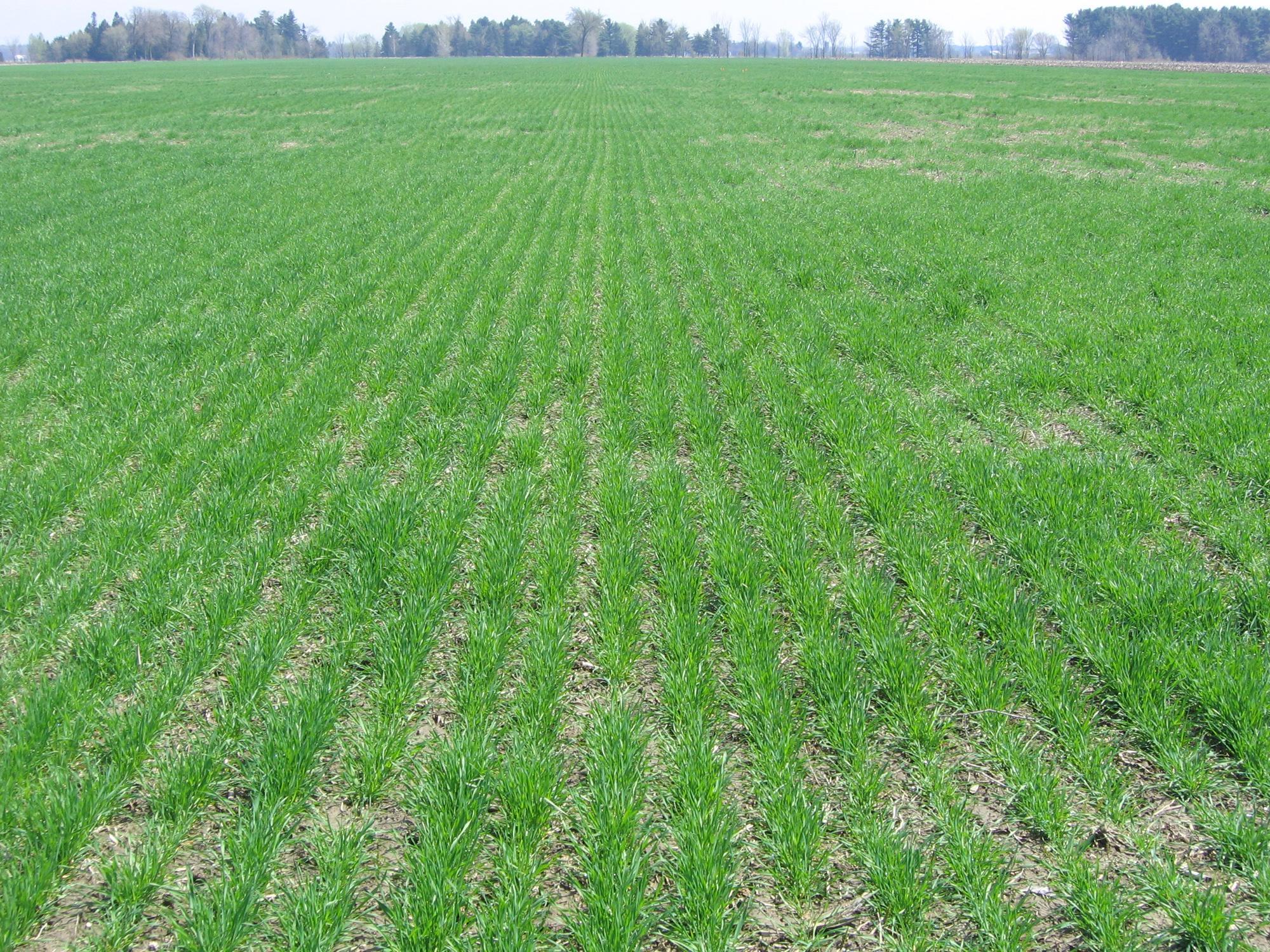Description: Dans un champ de blé d’automne, des zones dégarnies sont composées de plants qui ont un faible développement ou qui sont desséchés à la suite d’une mauvaise survie à l'hiver. Les zones où les plants sont morts correspondent à de petites baissières où l'eau s'est accumulée et où les plants sont morts par asphyxie par la glace (gel hivernal). Cette culture de blé d'automne a été ensemencée sur un sol nivelé. La photo a été prise au début mai.