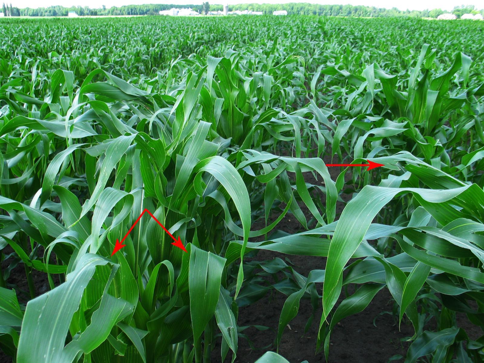 Description: Le limbe de certaines feuilles de maïs grain et fourrager s’est déchiré (voir flèches) sous l’impact de la grêle. Les feuilles médianes et terminales sont les plus touchées. Les feuilles lacérées sont réparties aléatoirement dans le champ.
