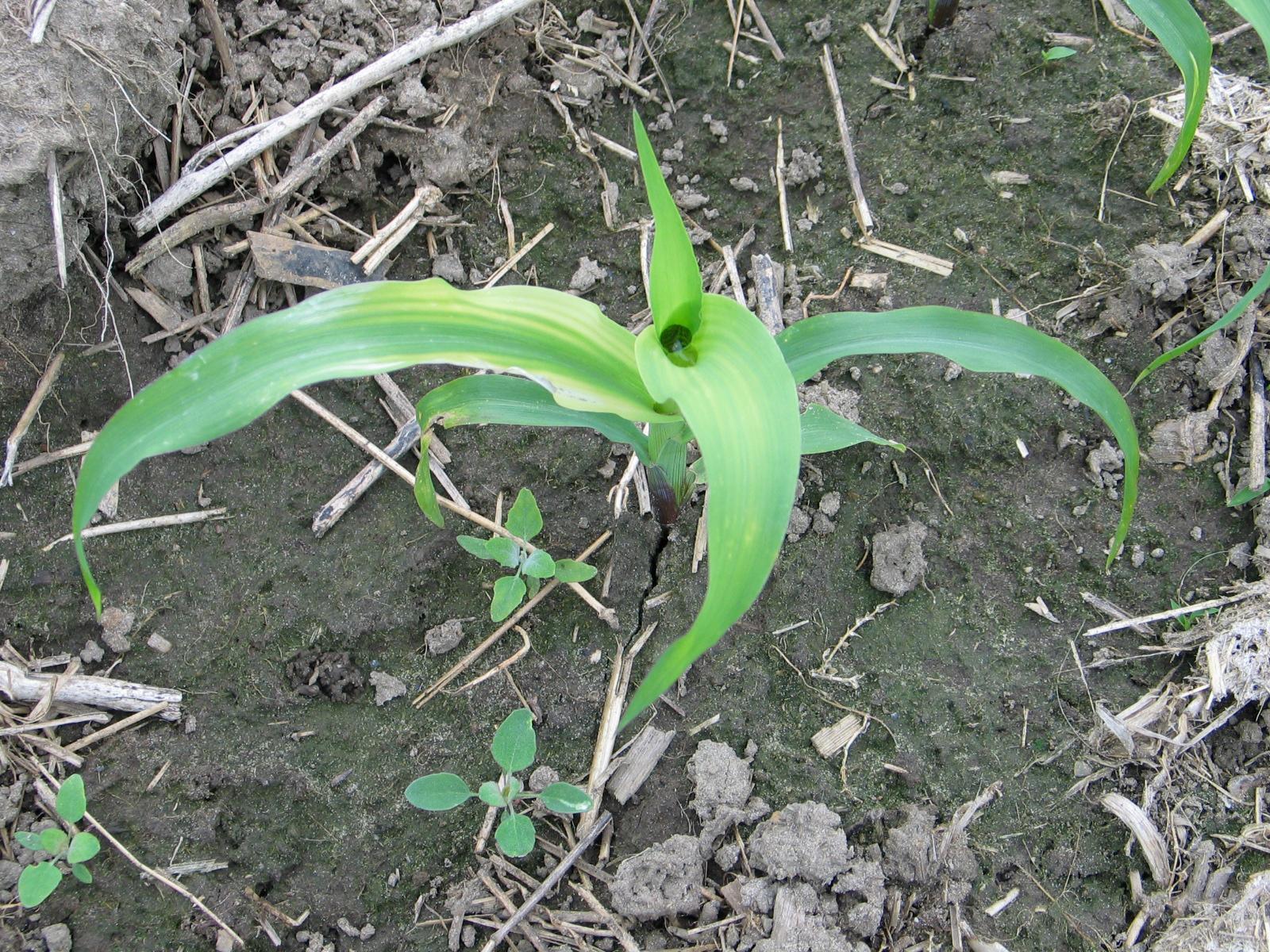 Description: Sur un jeune plant de maïs grain et fourrager, une feuille médiane montre une large bande jaunâtre à blanchâtre de chaque côté de la nervure centrale qui demeure verte. Cette anomalie de coloration se trouve dans le tiers inférieur de la feuille. Les jeunes feuilles montrent de petites bandes jaunes. Quant à elles, les vieilles feuilles sont vertes. Ces symptômes sont caractéristiques de la carence en zinc chez le maïs grain et fourrager.