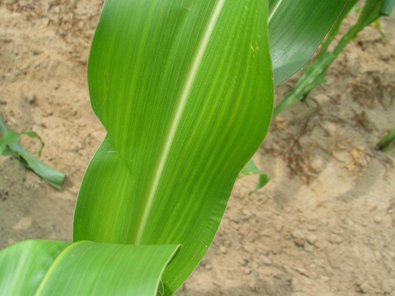 Description: Une feuille de maïs grain et fourrager montre des stries jaunes à blanches du limbe entre les nervures qui demeurent vertes. Ce symptôme est caractéristique de la carence en magnésium chez le maïs.