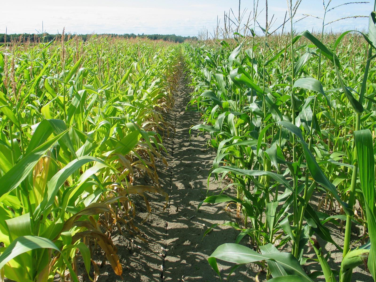 Description: Le maïs du champ de gauche a été semé sans engrais de démarrage tandis que le maïs du champ de droite a été semé en utilisant un engrais de démarrage et un engrais (33-0-16,9) lors du sarclage. Les plants sans engrais sont jaunes, moins bien développés et les feuilles basales sont desséchées ou brûlées.
