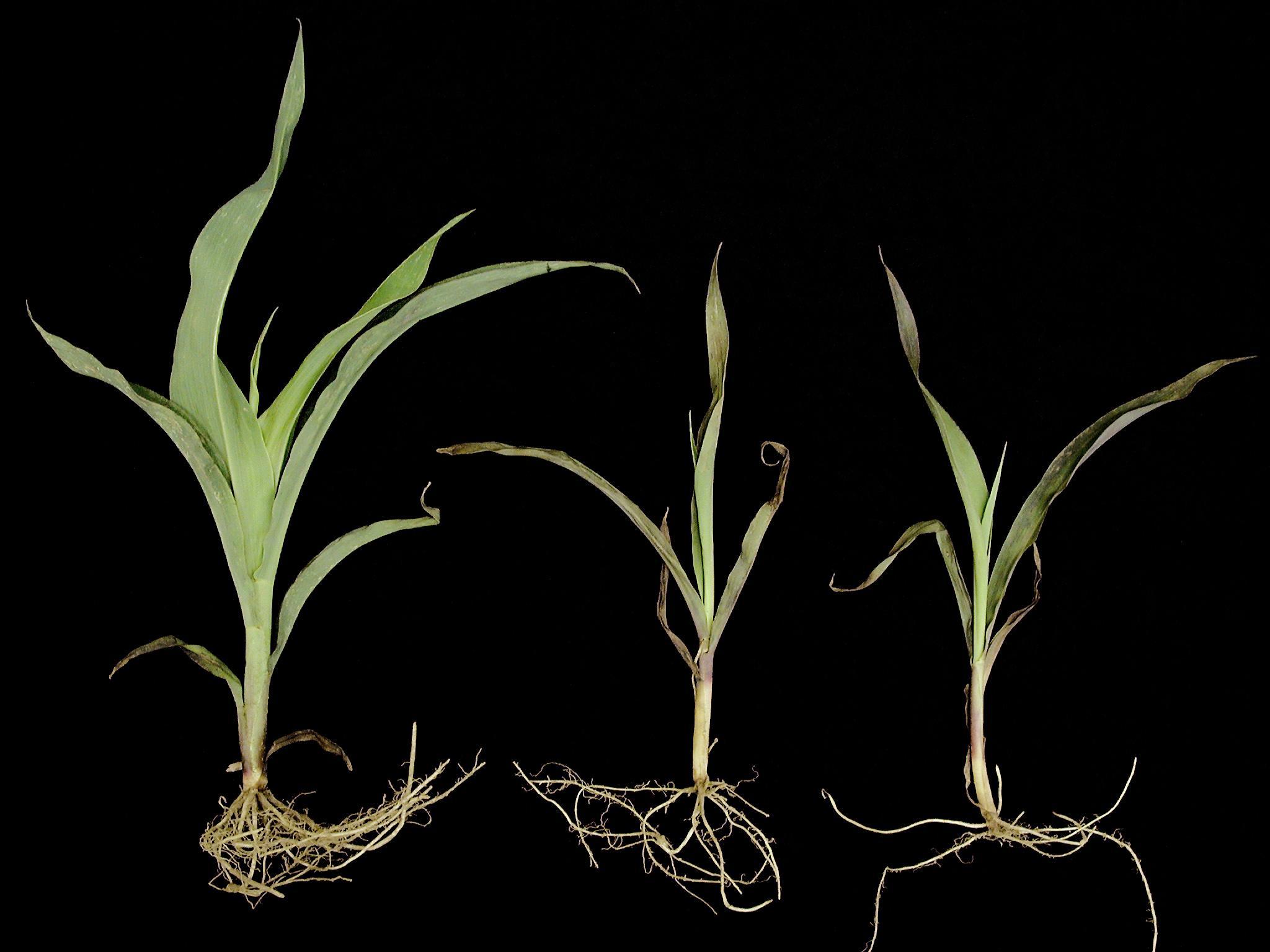 Description: Lorsque comparés à un plant de maïs sain, les plants affectés sont plus petits et présentent une coloration pourpre à l'apex et la marge du limbe. Cette anomalie de coloration est présente à la face supérieure et inférieure. Les dommages sont apparents sur les feuilles basales et médianes. Le système racinaire est faiblement développé avec de longues racines blanches et peu de racines secondaires et de poils absorbants (non visible ici). Les tests de laboratoire ont révélé un pH acide du substrat (4,6). Ce pH acide a libéré dans le sol des ions aluminium toxiques pour la plante qui ont affecté le développement du système racinaire.