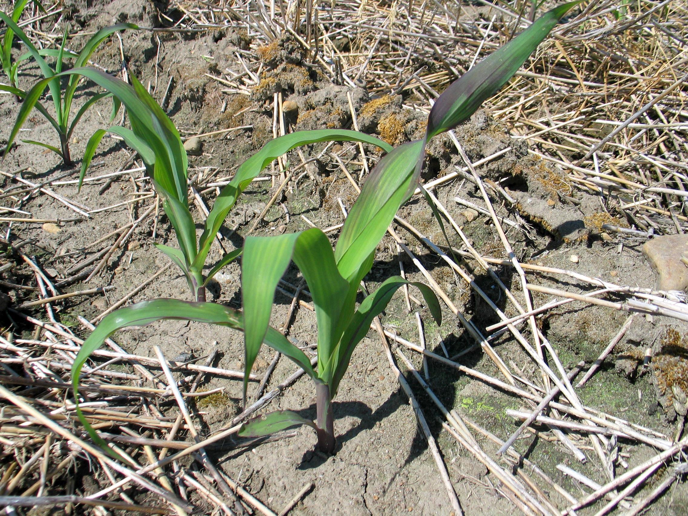Description: De jeunes plants de maïs grain et fourrager, au stade 4 à 5 feuilles, montrent différentes intensités de mauve sur les feuilles. Tous les niveaux de feuille sont touchés. Ce symptôme est caractéristique de basses températures de l'air (froid) en début de saison.   En 2007, dans la région du Centre-du-Québec, d’autres champs ont subi un stress semblable et présentaient tous le même patron de coloration mauve. Dans ces champs, les beaux gros plants n'étaient pas mauves, alors que les plus petits l'étaient. Le sol était un sable limoneux avec un drainage déficient.