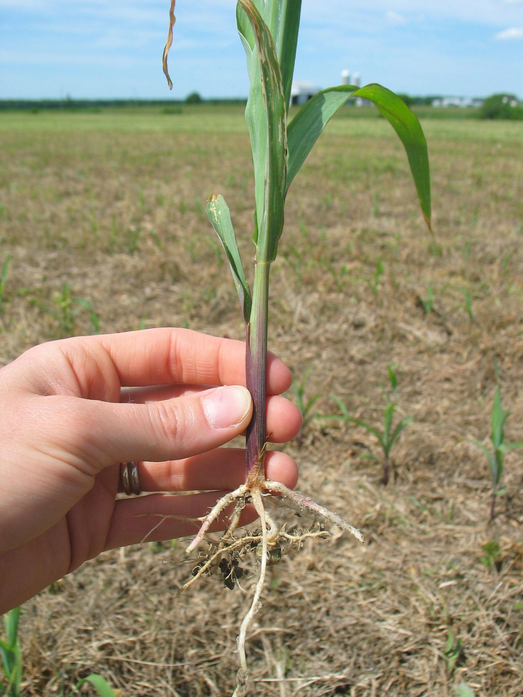 Description: Un plant de maïs grain et fourrager montre un faible développement du système racinaire avec peu de racines secondaires et de poils absorbants. Certaines racines sont déformées. En juin, lors d’une longue période chaude et sèche, la partie aérienne a montré des feuilles enroulées à cause d’un grand stress hydrique imputable à un enracinement insuffisant dû au semis fait dans les résidus de culture et un sol compacté.