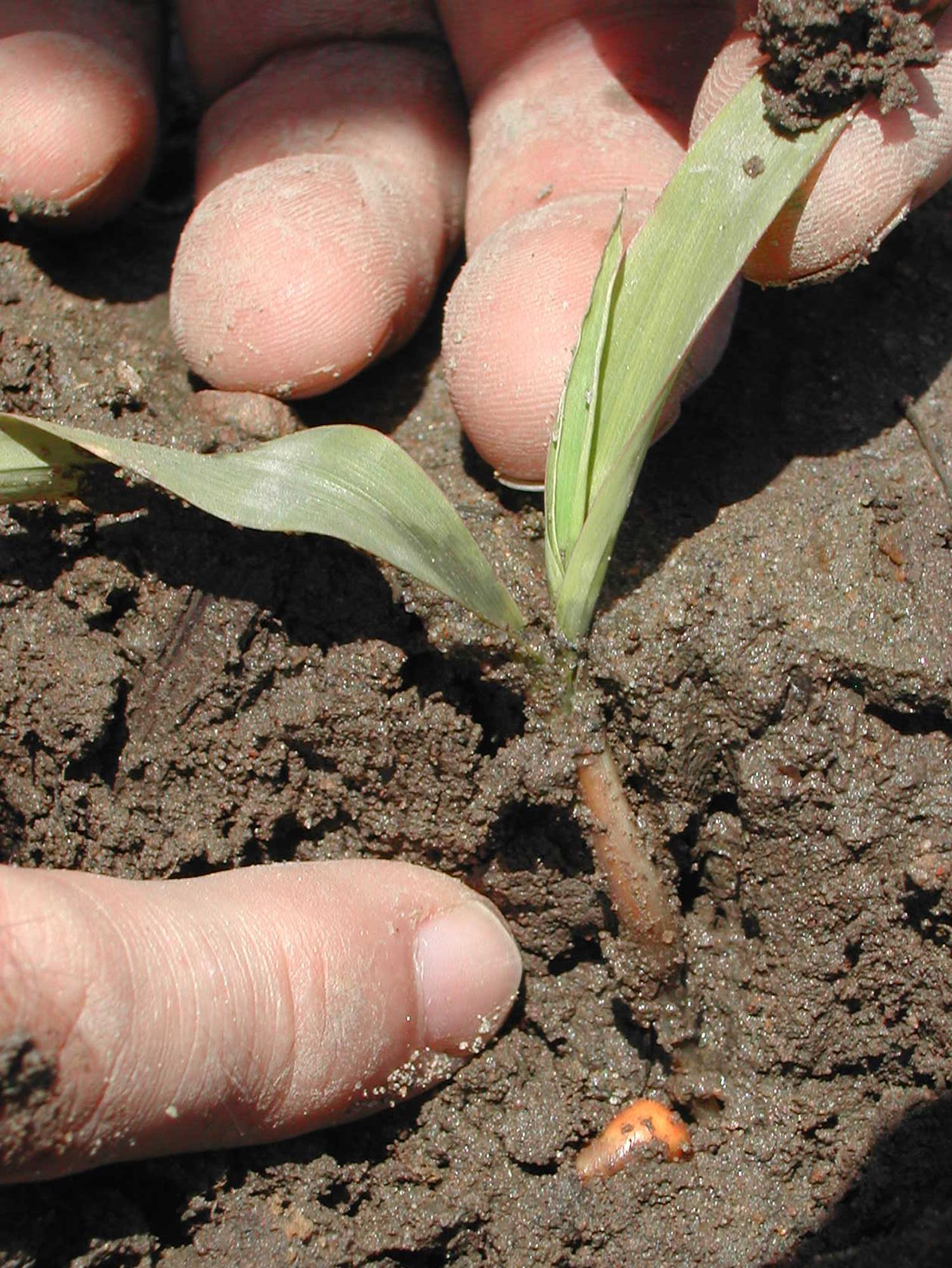 Description: Le collet de cette plantule de maïs grain et fourrager est brun et pourri. Le drainage du champ est déficient, ce qui a causé un excès d’eau dans les zones non drainées et favorisé une infection fongique indéterminée.