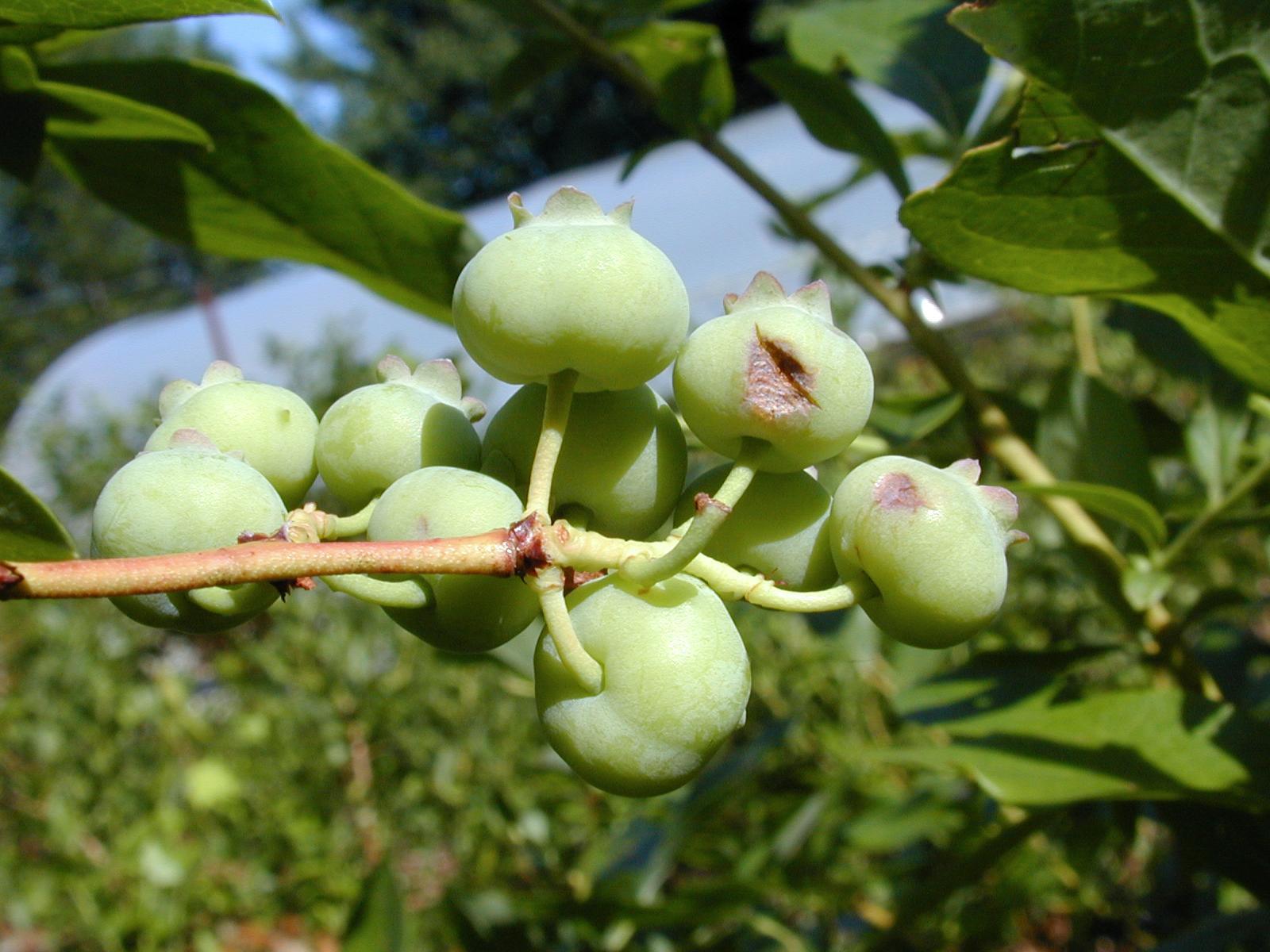 Description: Affaissement de l'épiderme des fruits verts de bleuets en corymbe à la suite d’un épisode de grêle. L’épiderme est déprimé, parfois fendu, et bleuit prématurément. Les symptômes n’évoluent pas. Seule la partie la plus exposée des fruits présente des dommages.