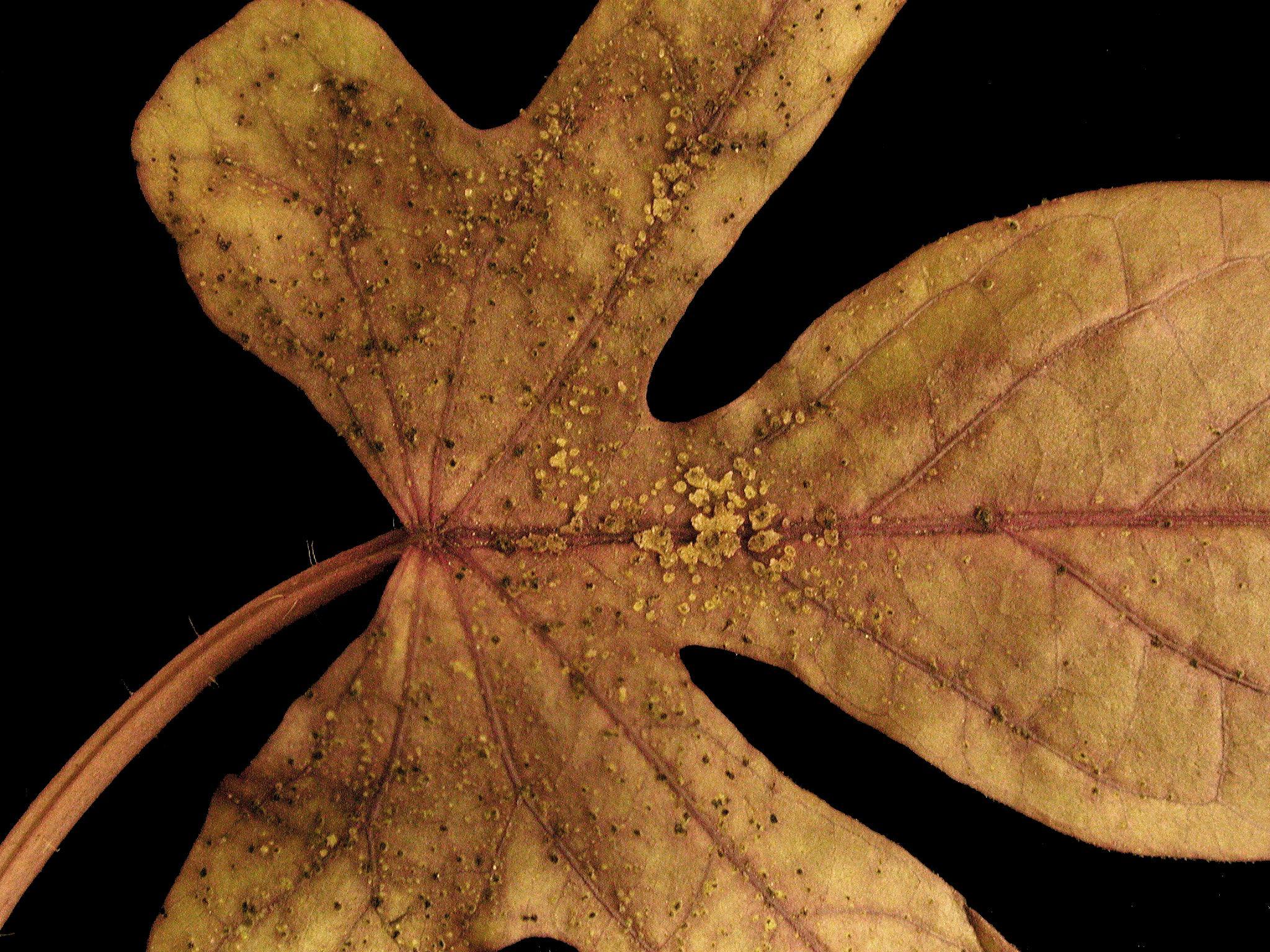 Légende: Protubérances blanchâtres et noires sur une feuille d'ipomée