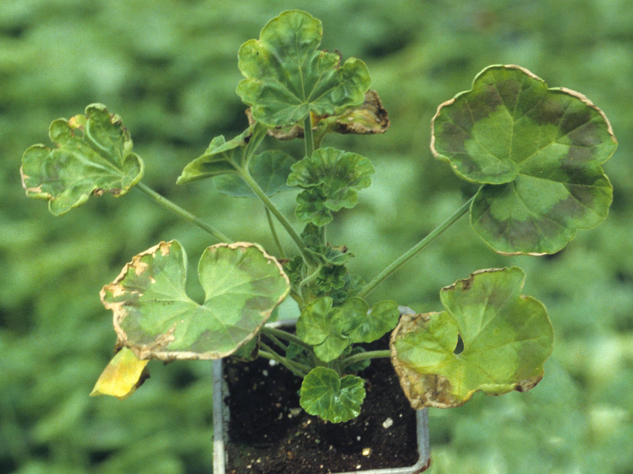 Légende: Brûlures marginales sur feuilles de géranium zonal