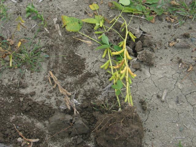 Description: Comparaison entre des plants de soya qui ont poussé dans un sol compacté (à gauche) et moins compacté. Le plant de gauche est dépéri, desséché avec un système racinaire restreint et des racines brunes. Les plants de droite ont une meilleure croissance malgré qu’ils commencent à jaunir. Les racines sont également mieux développées et blanches.