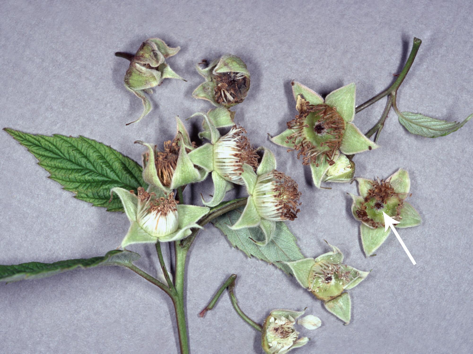 Description: Sur les fleurs de framboisier, tous les pistils sont affectés et le centre de la fleur apparait noirci et brûlé (voir flèche). Les étamines sont brunes et déformées. Les dommages sont causés par un gel printanier tardif. Toutes les fleurs ont gelé partiellement ou complètement. Les fruits formés seront déformés.