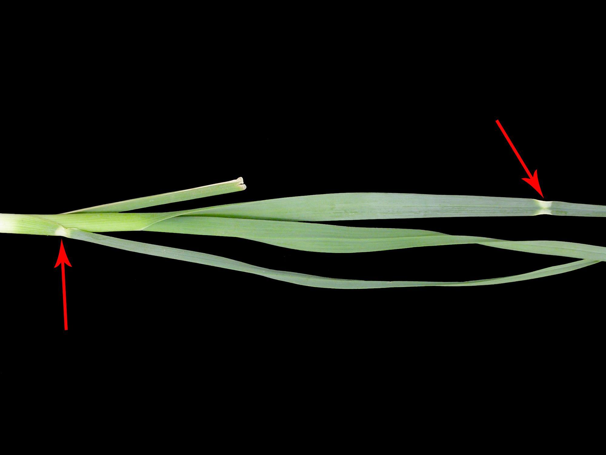 Description: Sur des feuilles de plantules de poireau (cv 'Belton') cultivées au champ, présence d’un blanchiment et d’une constriction sur les feuilles médianes et basales (voir flèches). Lorsque les symptômes sont apparus, les plantules venaient d’être transplantées au champ. Ces symptômes sont caractéristiques d’un gel printanier et de grands écarts de température entre le jour et la nuit.