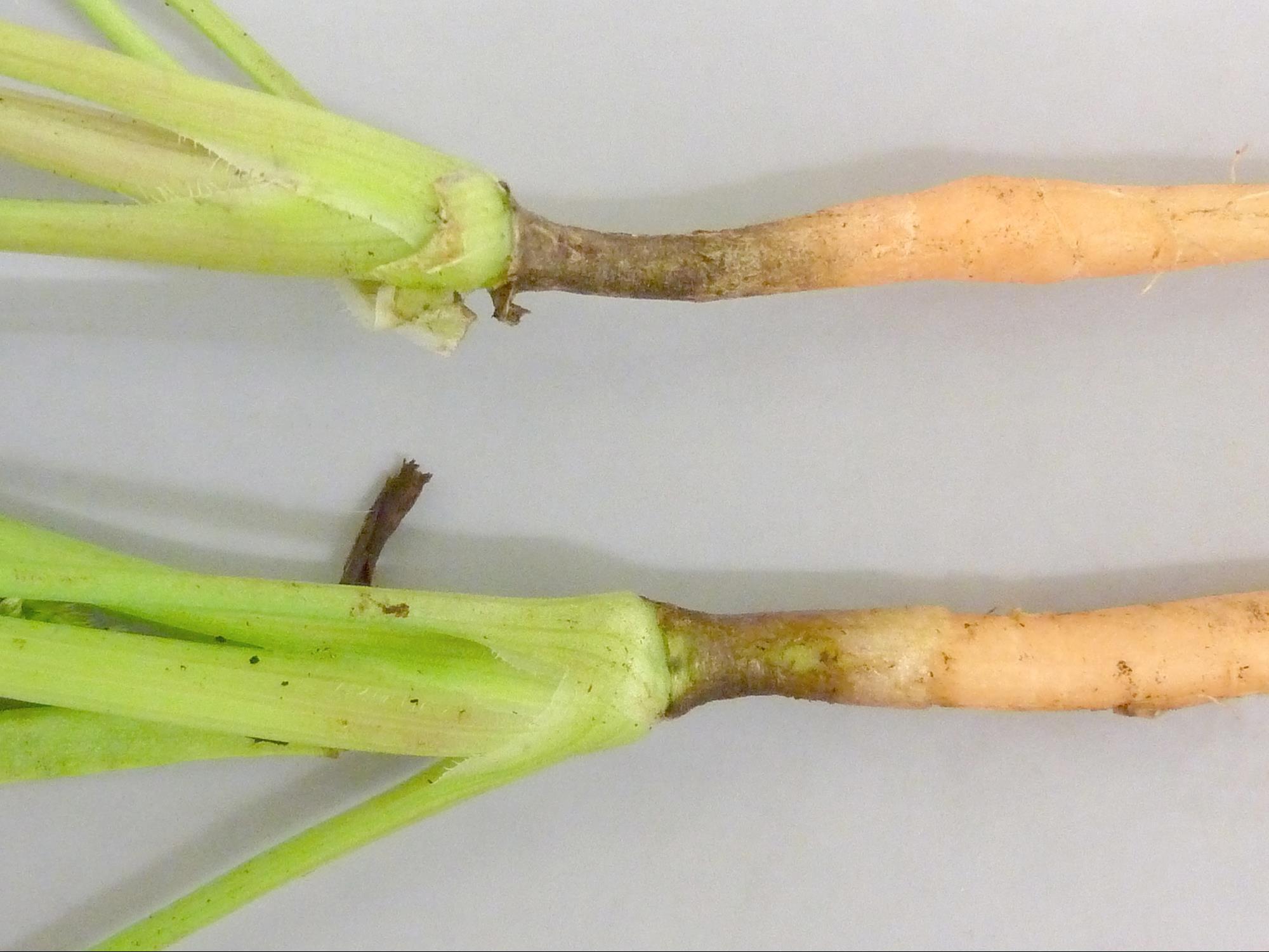 Description: Sur de jeunes plants de carottes (cv 'Endy') cultivés au champ, présence d’une constriction brunâtre, liégeuse et superficielle au collet. La racine est sans symptôme. Ce symptôme est typique d’un chancre de chaleur causé par des températures élevées à la surface du sol. Les plants affectés (10 %) sont cultivés en terre noire et distribués en foyer, au centre du champ. Il y avait probablement des îlots de chaleur à cet endroit.