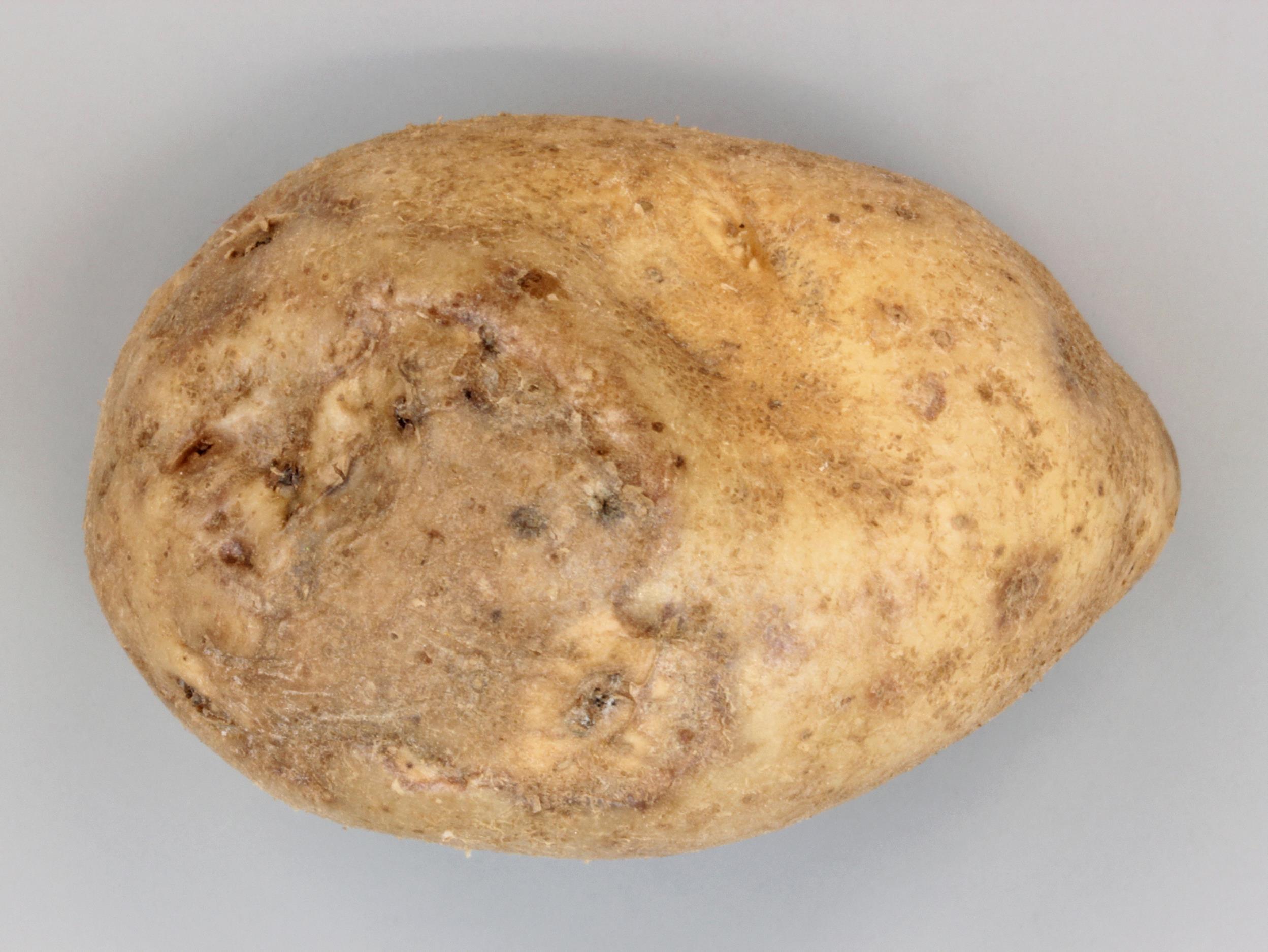 Description: Le périderme d’un tubercule de pomme de terre (cv 'Goldrush') provenant d’un entrepôt montre une large zone foncée et déprimée, d’une forme irrégulière, dans la région du talon. Sous ces zones, la chair est brune sur quelques millimètres de profondeur et l’anneau vasculaire est noir dans la zone affectée (non visible ici). Aucun agent pathogène n’a été détecté des tubercules. Ces symptômes sont causés par du gel en entrepôt (température basse de l’air).