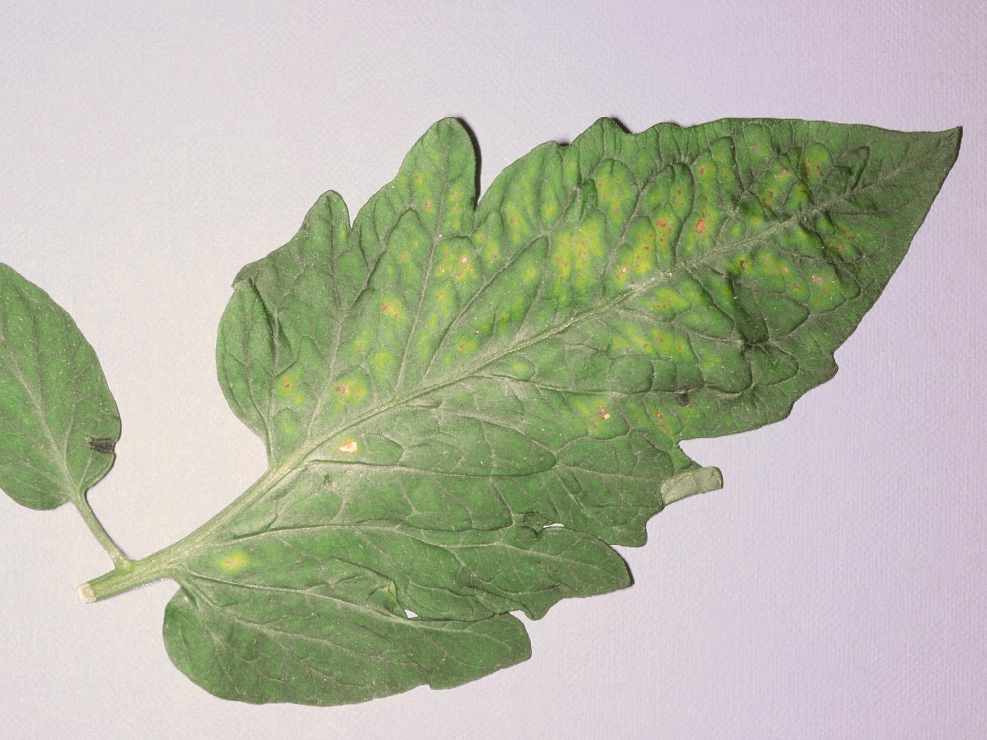 Description: Une foliole de tomate de serre montre un début de jaunissement entre les nervures principales qui demeurent vertes. De petites brûlures apparaissent entre les nervures. Ces symptômes sont caractéristiques d’une carence en magnésium chez la tomate.